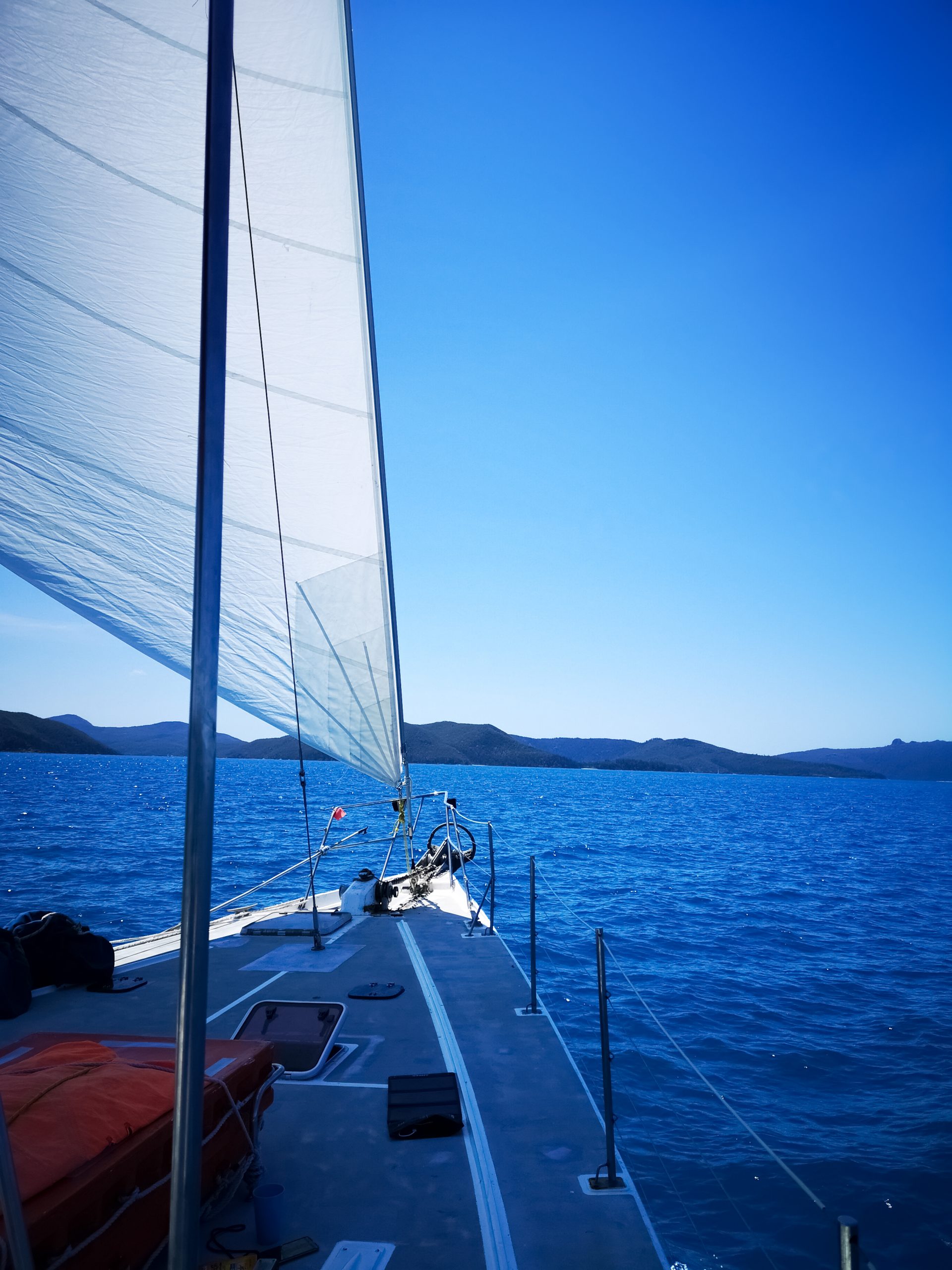 Puis le jour J de notre séjour est arrivé! Rendez-vous à Airlie Beach 8h00, nous avons rempli un formulaire et emprunté une combinaison de plonger. Nous étions 22 personnes à aborder le voilier “El Matador”! L’équipage au nombre de 3 était composé du capitaine, imposant, avec sa barbe grise et son cache oeil droit. Il ressemblait à un capitaine pirate (il ne lui manquait plus qu’un perroquet). Le reste de l’équipage était composé d’un jeune homme et d’une jeune fille qui s’occupaient de la gestion du bateau et de la cuisine.
