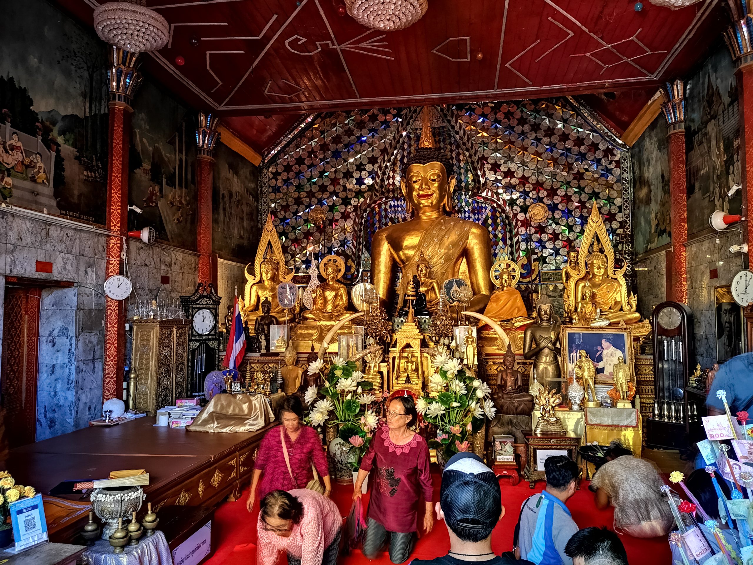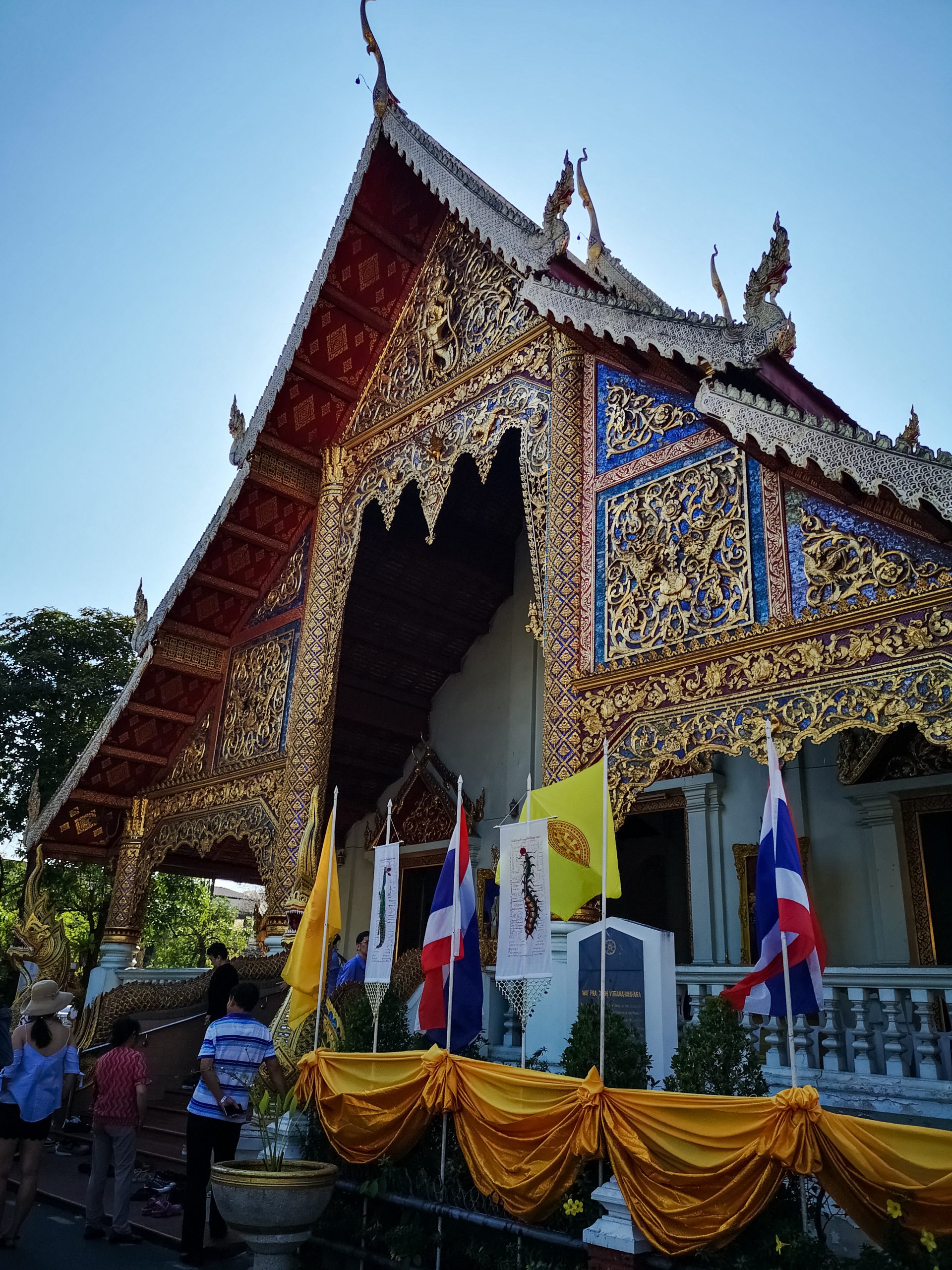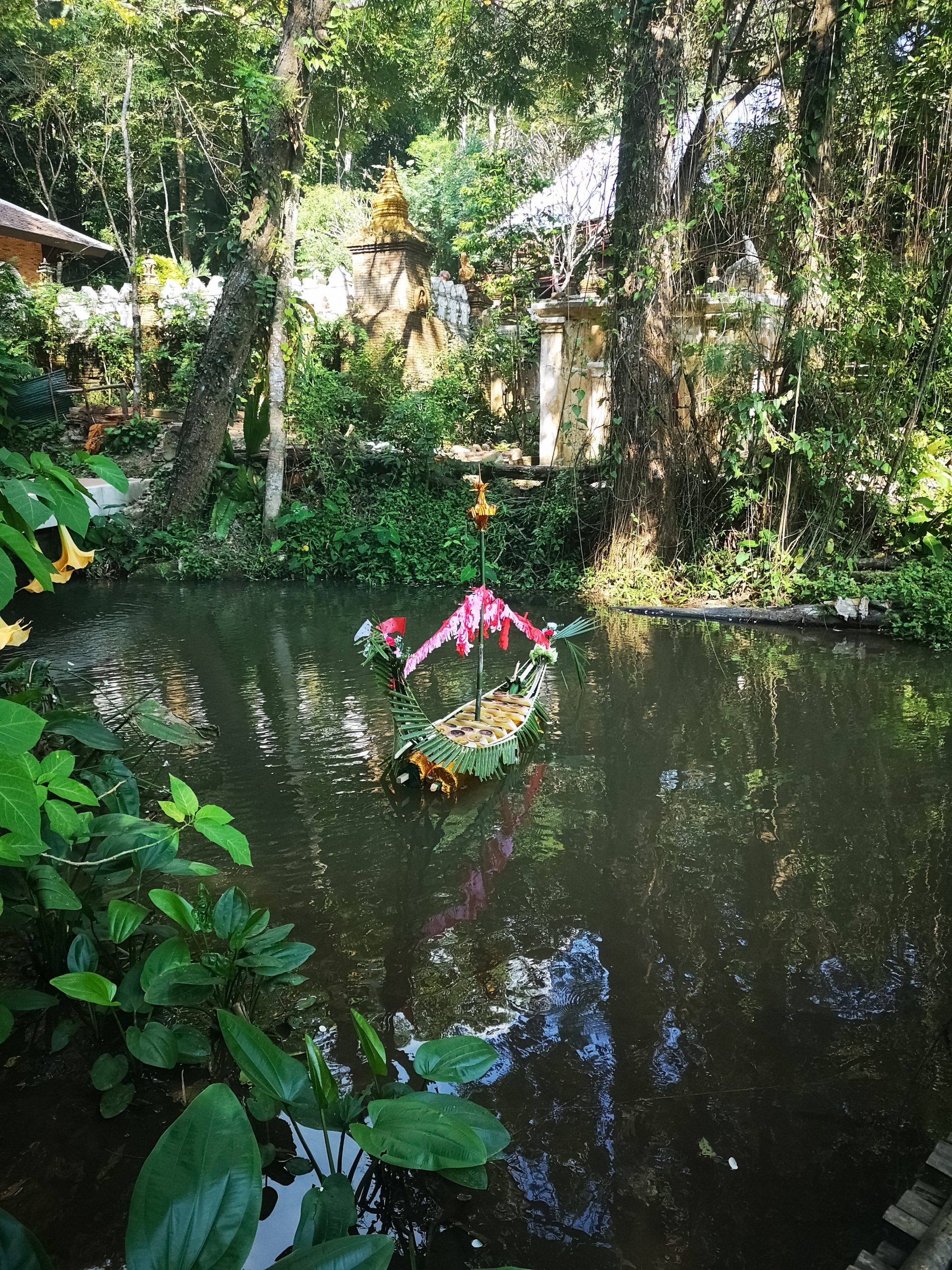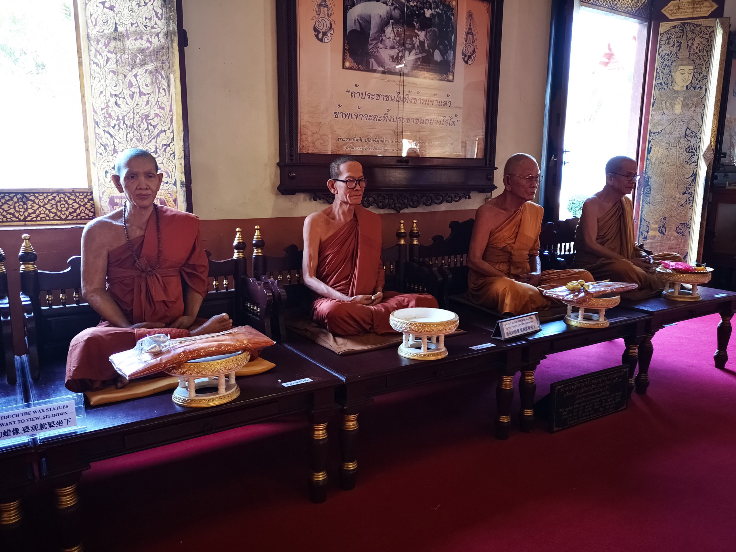 Nous reprenons la route vers le centre ville de Chiang Mai, en début d’après-midi. Pour la descente, nous optons cette fois ci un Song Twae pour 40/50 Bath. Il nous dépose au nord du old city puis nous marchons un peu pour se rendre au temple Wat Dab Pai. On enlève nos chaussures et je recouvre mes épaules avant d’entrer. Joliment orné de décorations, on peut observer un grand bouddha au fond de la pièce. À ses pieds, des offrandes et plusieurs thaïlandais qui se recueillent. Sur le côté droit, Johan et moi avons été bluffés par le réalisme des moines en méditations.