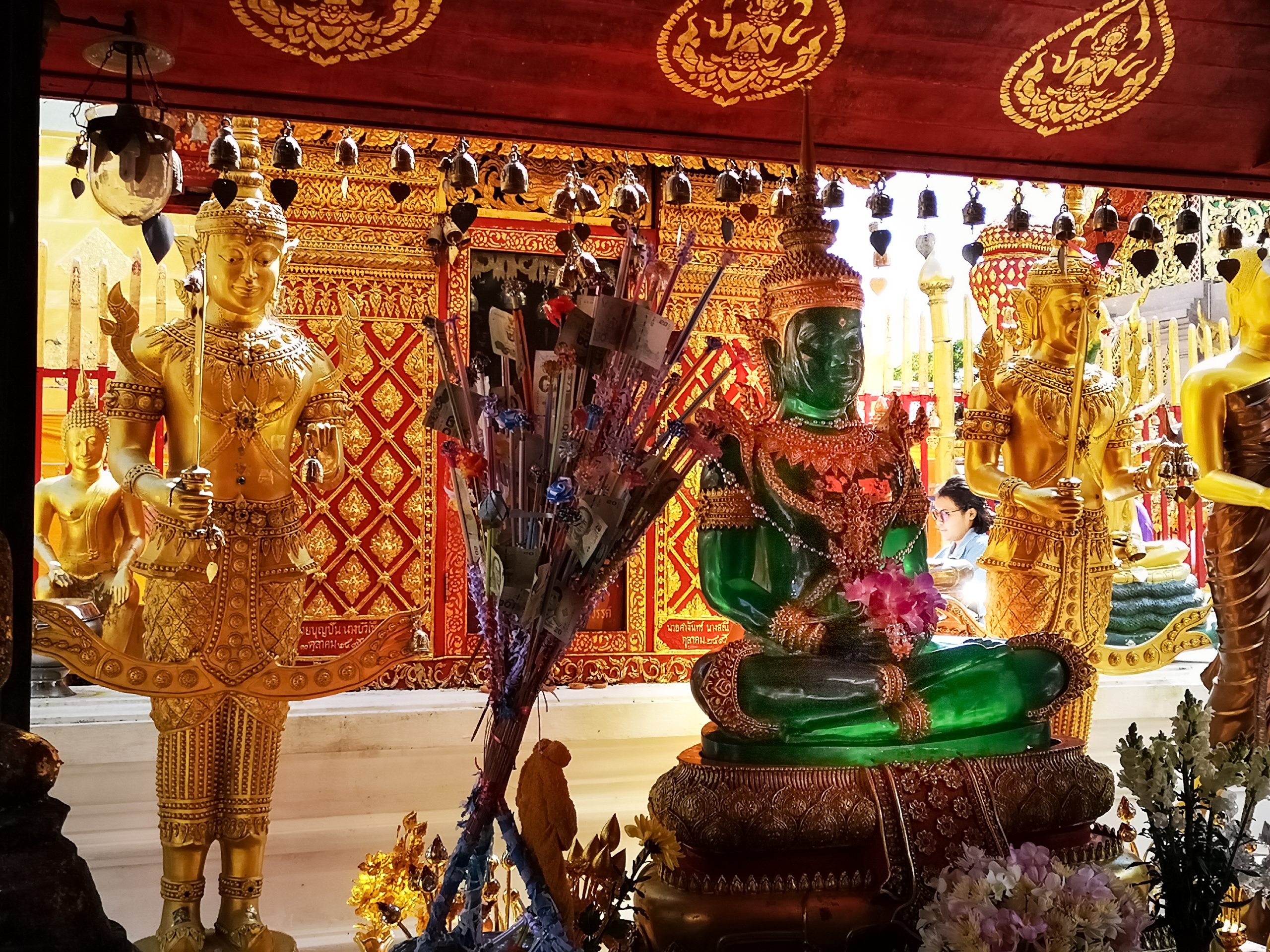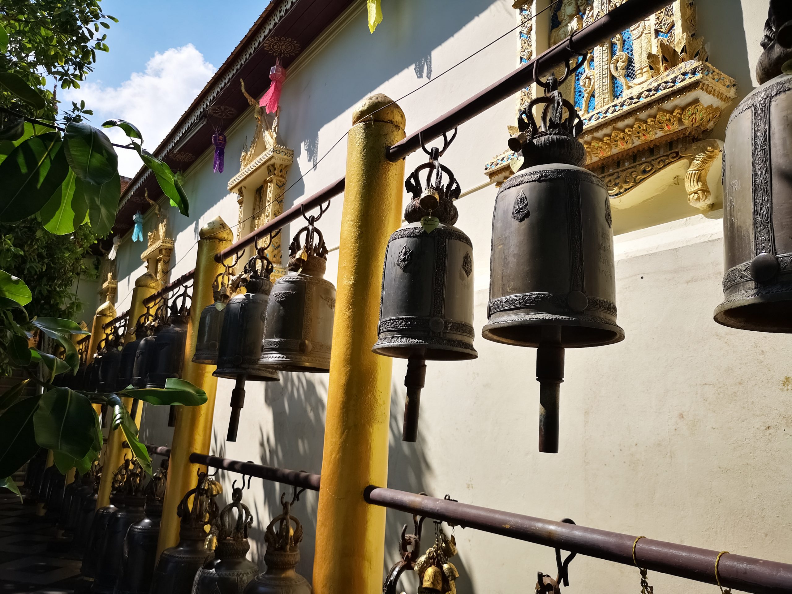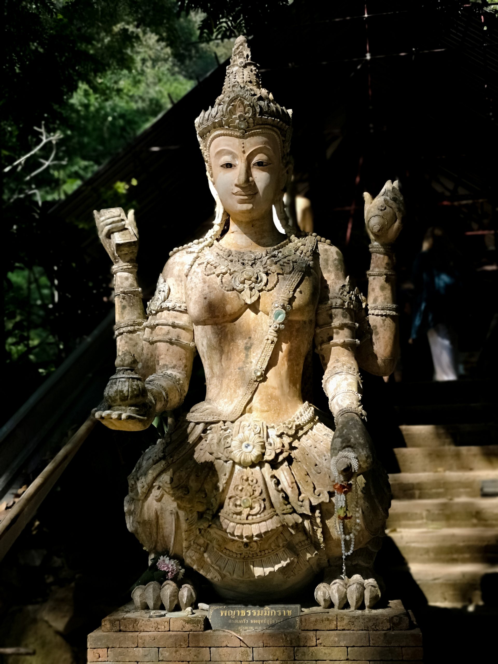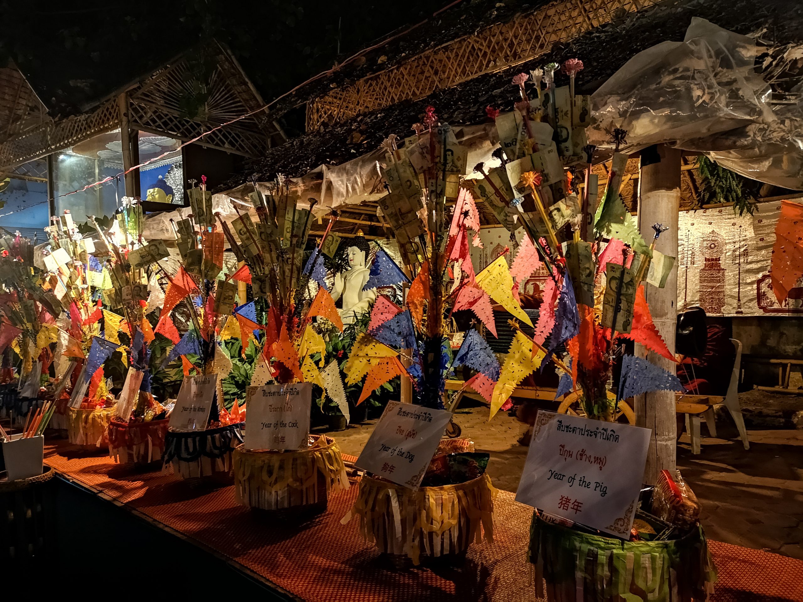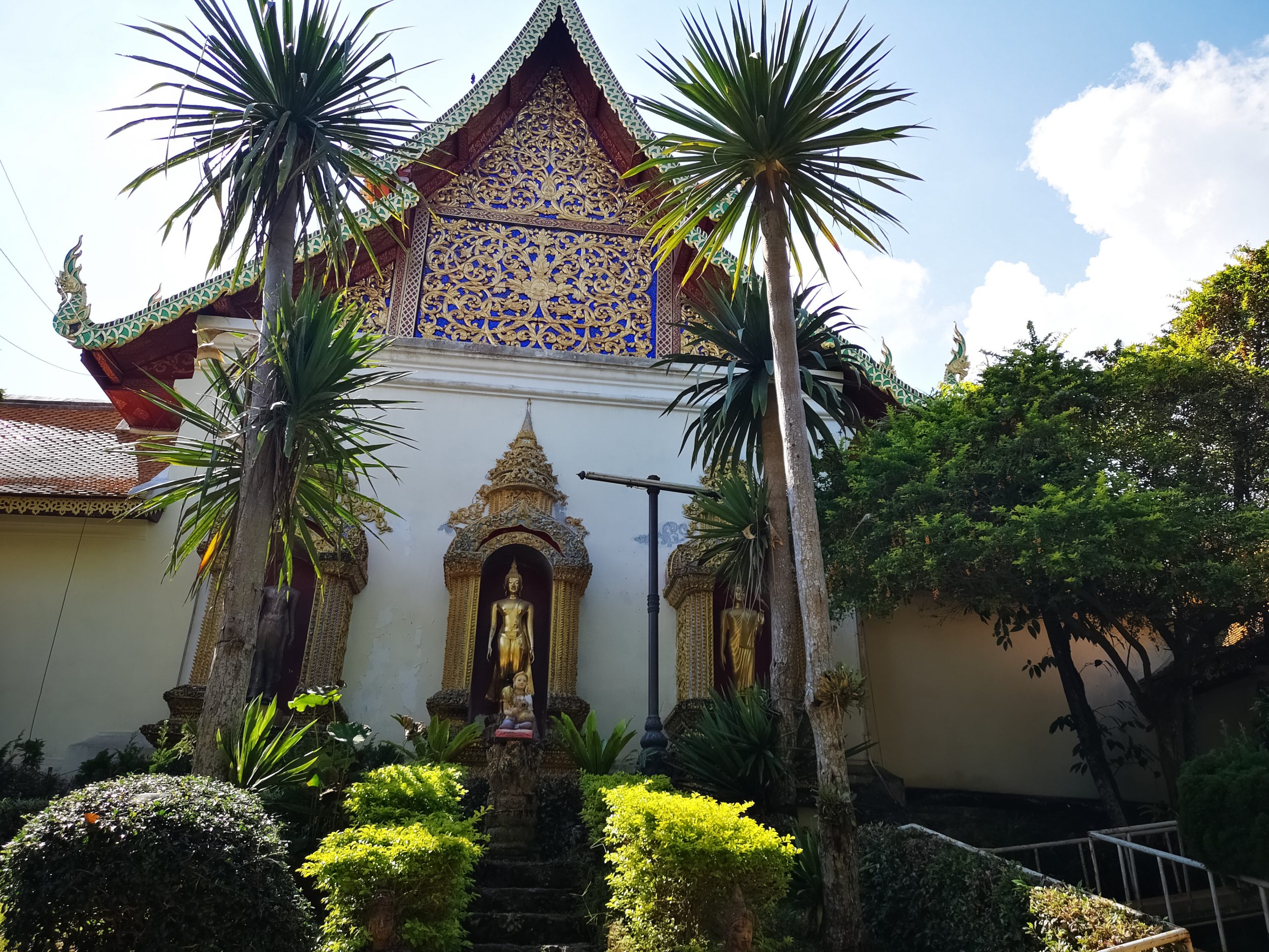 Nous reprenons la route vers le centre ville de Chiang Mai, en début d’après-midi. Pour la descente, nous optons cette fois ci un Song Twae pour 40/50 Bath. Il nous dépose au nord du old city puis nous marchons un peu pour se rendre au temple Wat Dab Pai. On enlève nos chaussures et je recouvre mes épaules avant d’entrer. Joliment orné de décorations, on peut observer un grand bouddha au fond de la pièce. À ses pieds, des offrandes et plusieurs thaïlandais qui se recueillent. Sur le côté droit, Johan et moi avons été bluffés par le réalisme des moines en méditations.