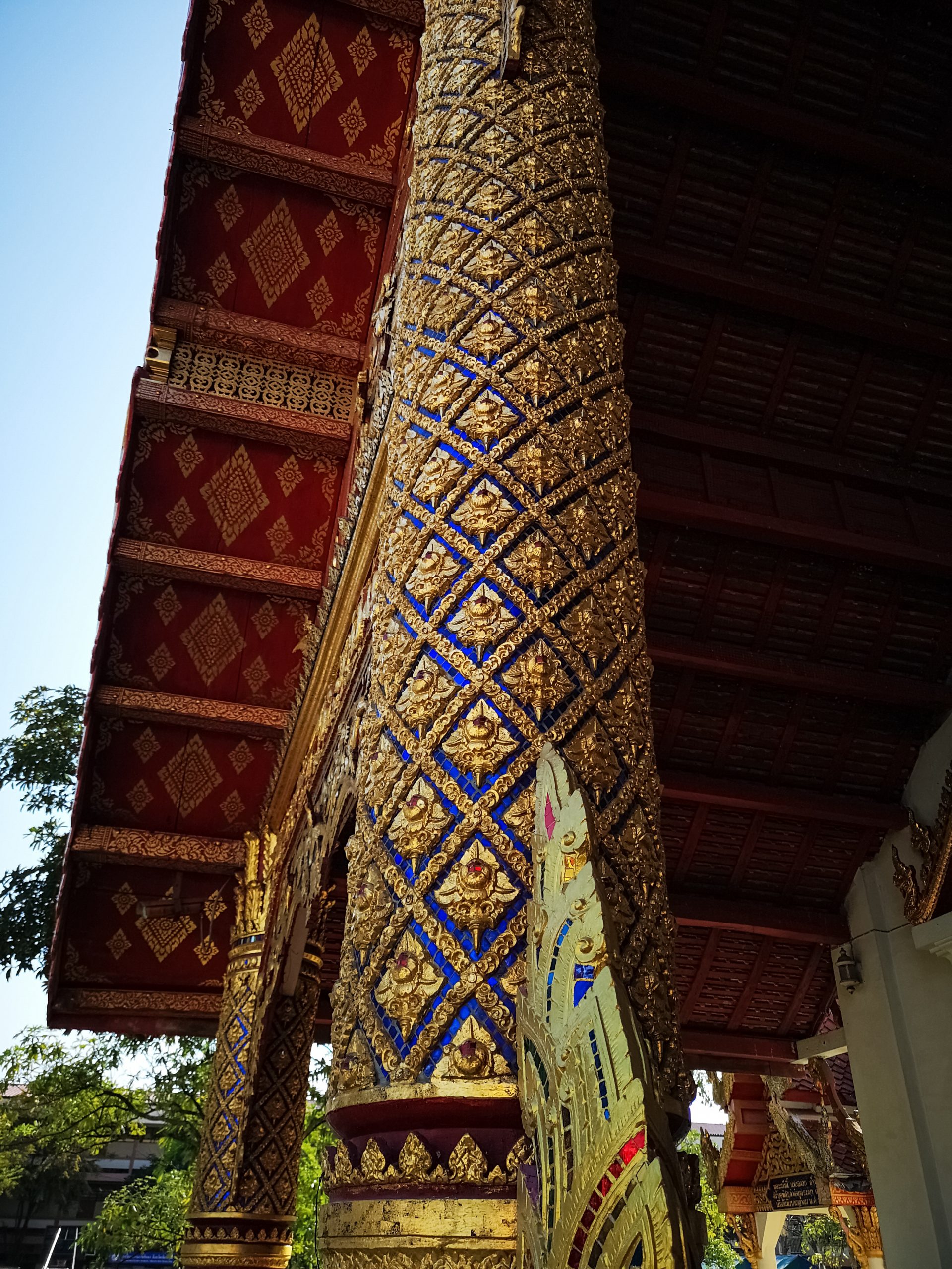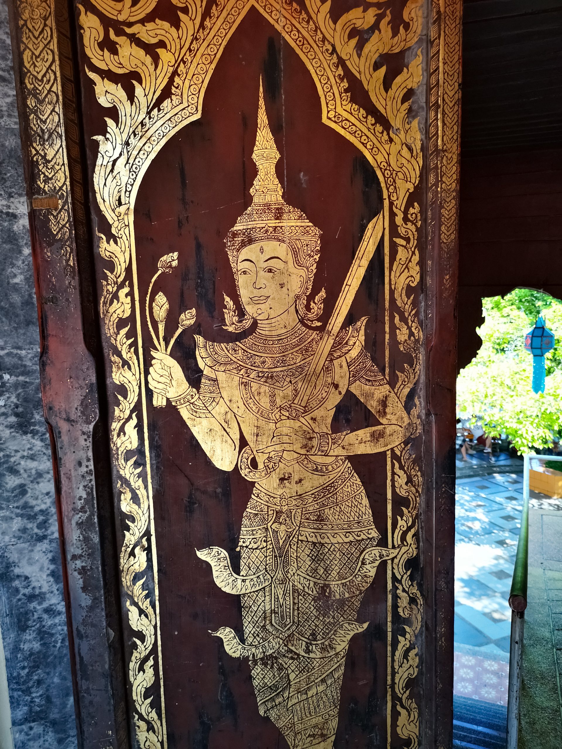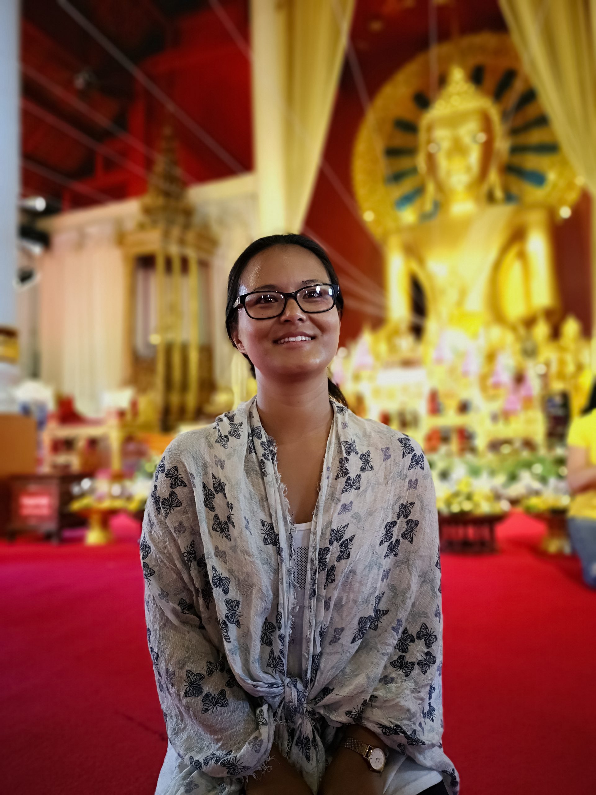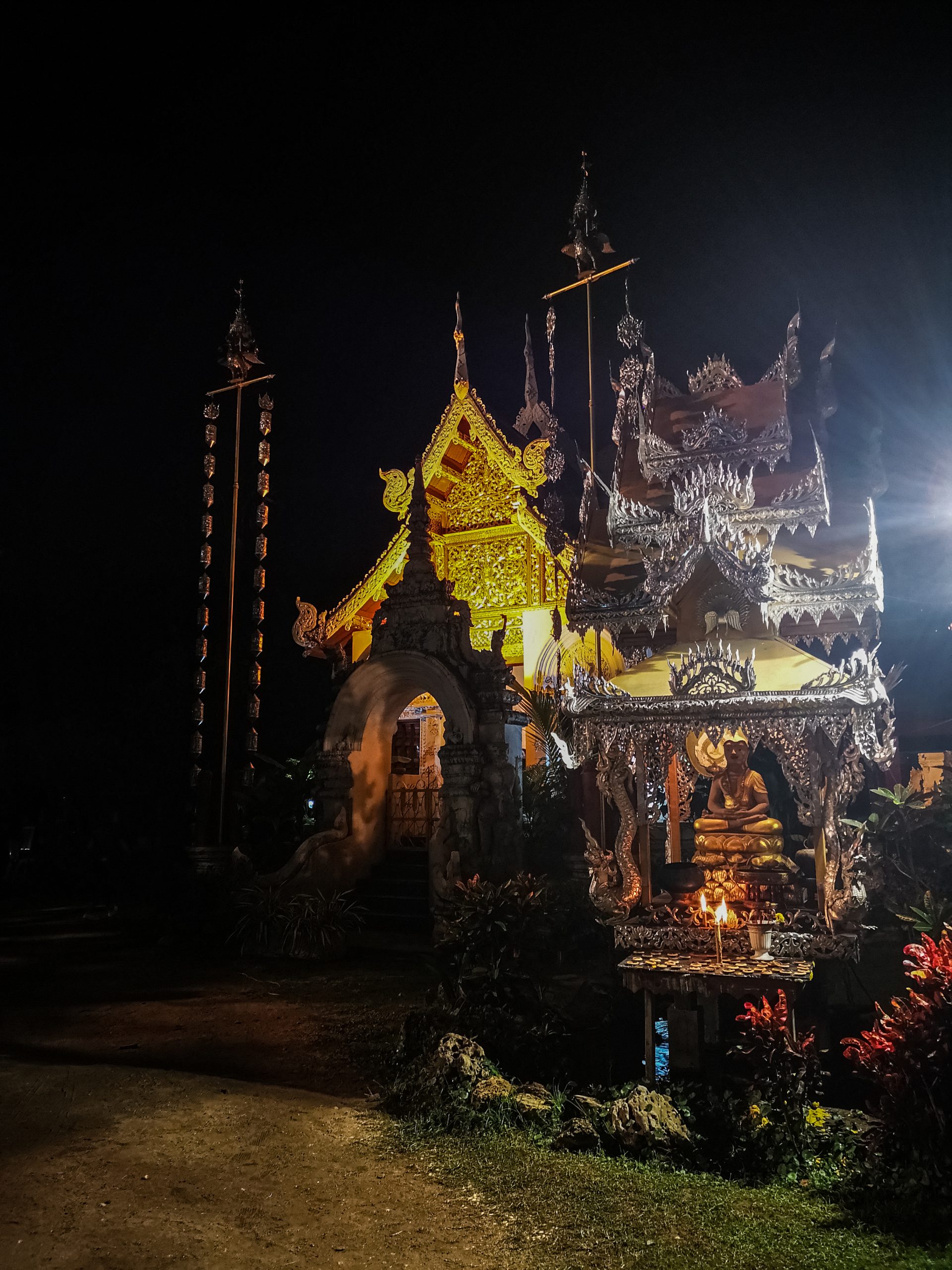 Nous reprenons la route vers le centre ville de Chiang Mai, en début d’après-midi. Pour la descente, nous optons cette fois ci un Song Twae pour 40/50 Bath. Il nous dépose au nord du old city puis nous marchons un peu pour se rendre au temple Wat Dab Pai. On enlève nos chaussures et je recouvre mes épaules avant d’entrer. Joliment orné de décorations, on peut observer un grand bouddha au fond de la pièce. À ses pieds, des offrandes et plusieurs thaïlandais qui se recueillent. Sur le côté droit, Johan et moi avons été bluffés par le réalisme des moines en méditations.