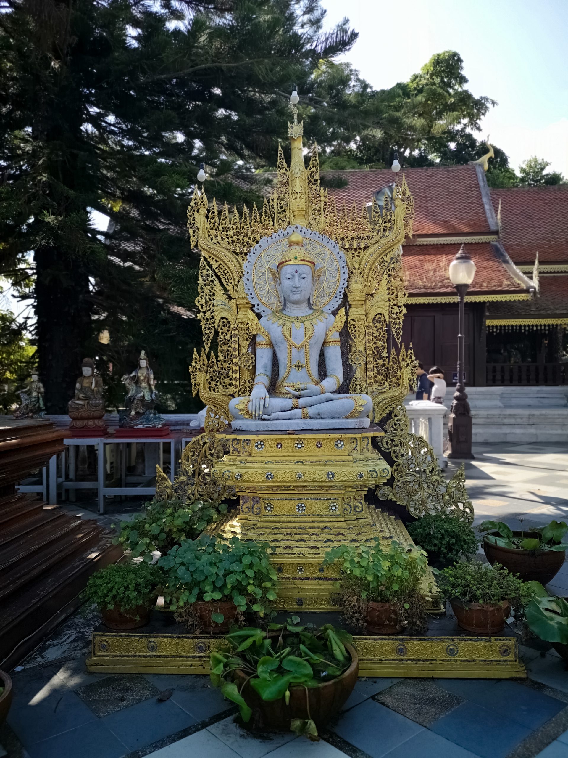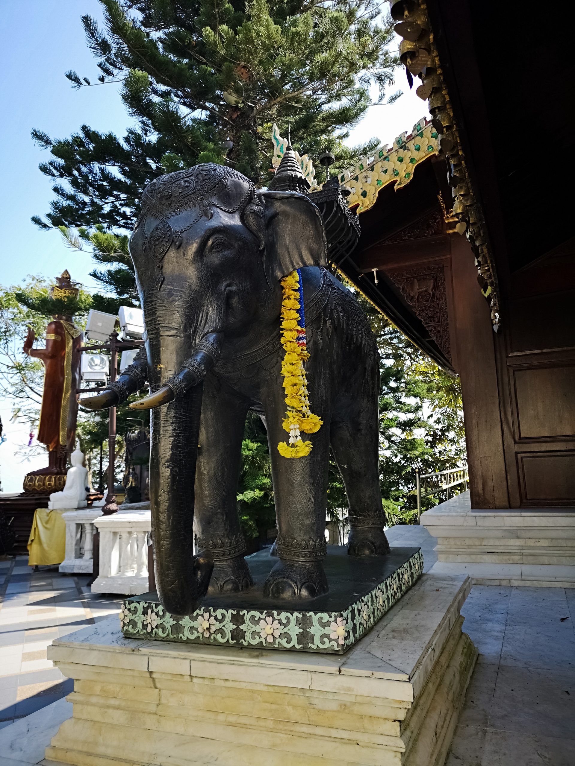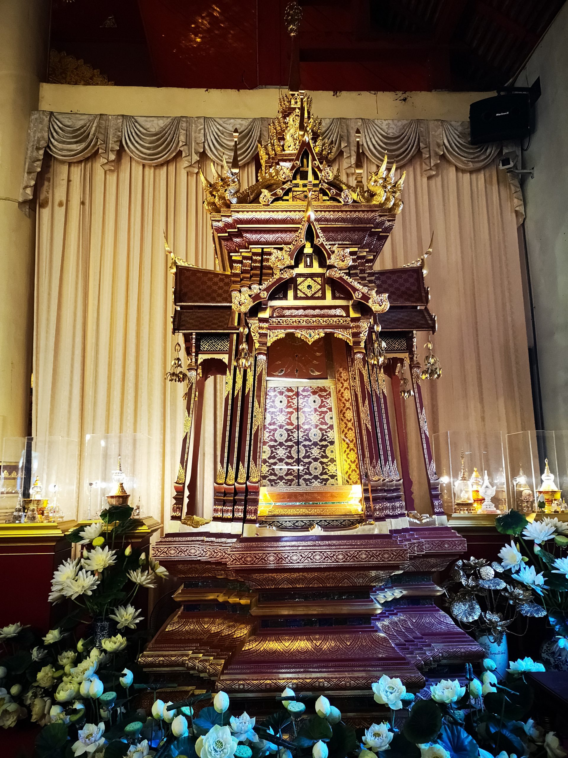 Sur le site se trouve une terrasse avec la légendaire statue de l’éléphant blanc qui portait, jadis, la relique de Bouddha. Plusieurs petits sanctuaires gravitent autour de la cours principale. Le plus important d’entre eux est celui du Chedi : haut de 24 mètres il est entièrement plaqué or. Les fidèles peuvent se recueillir devant les bouddhas situés à chaque angle mais aussi devant le bouddha allongé et le bouddha d’émeraude.