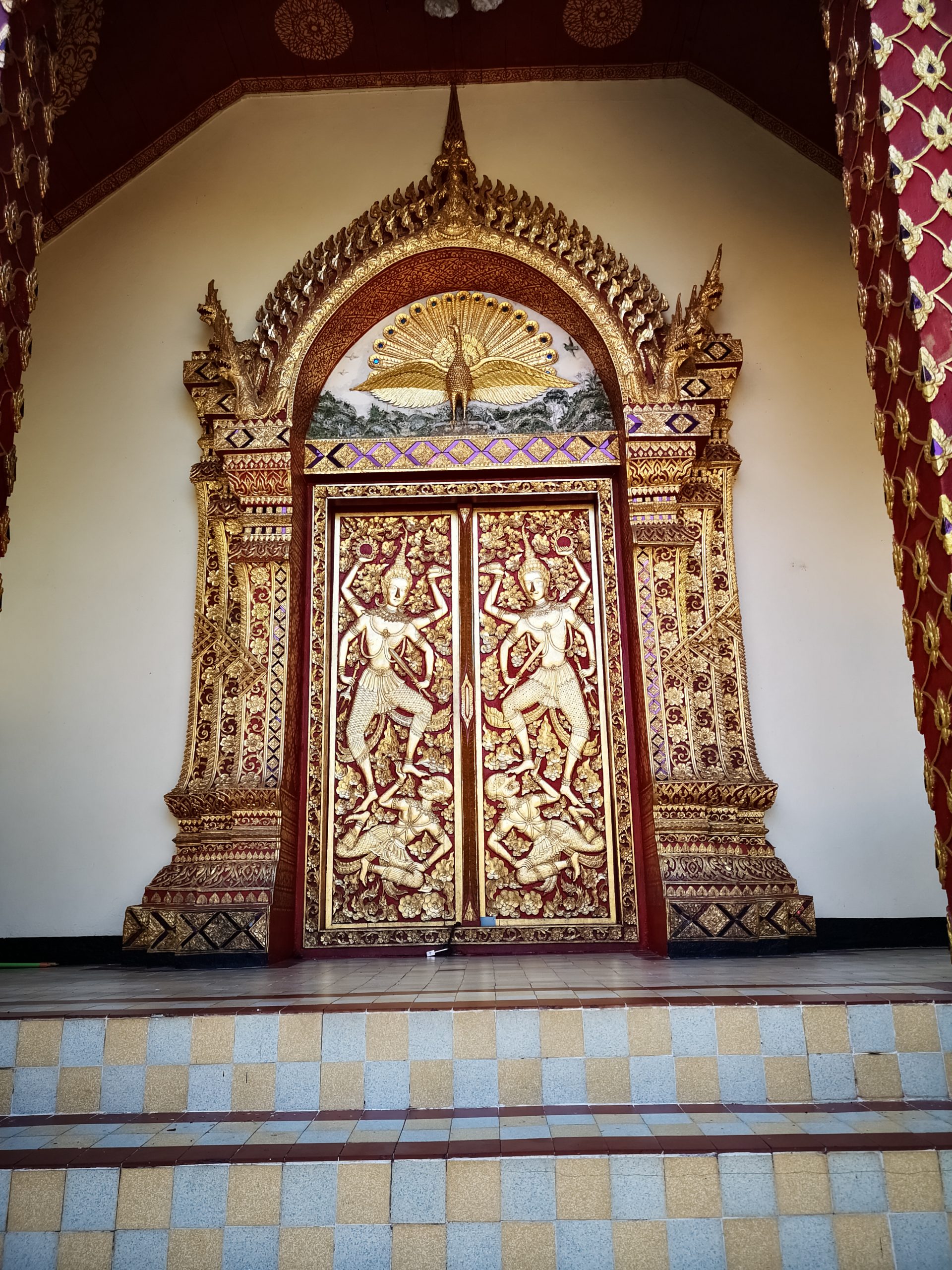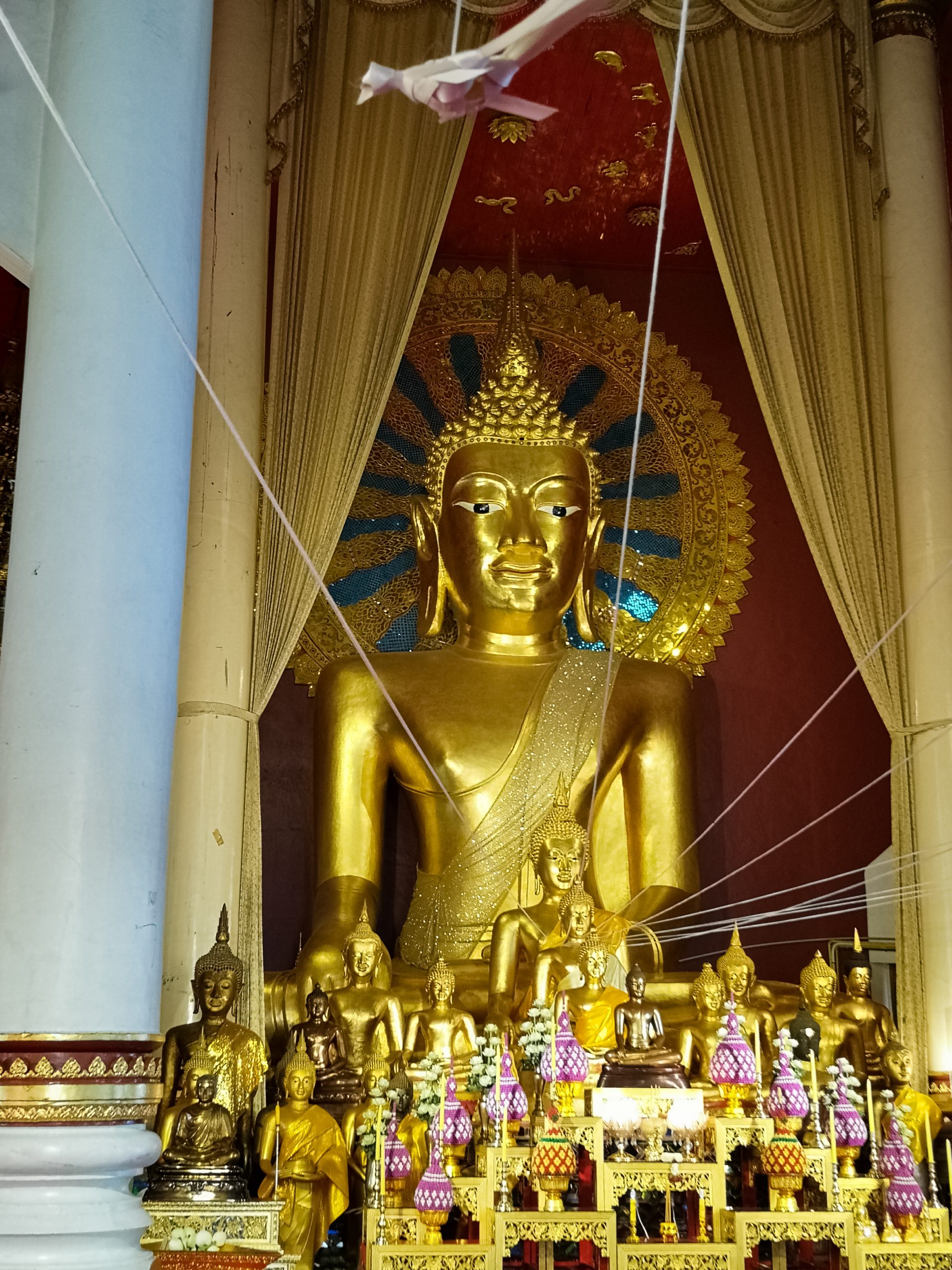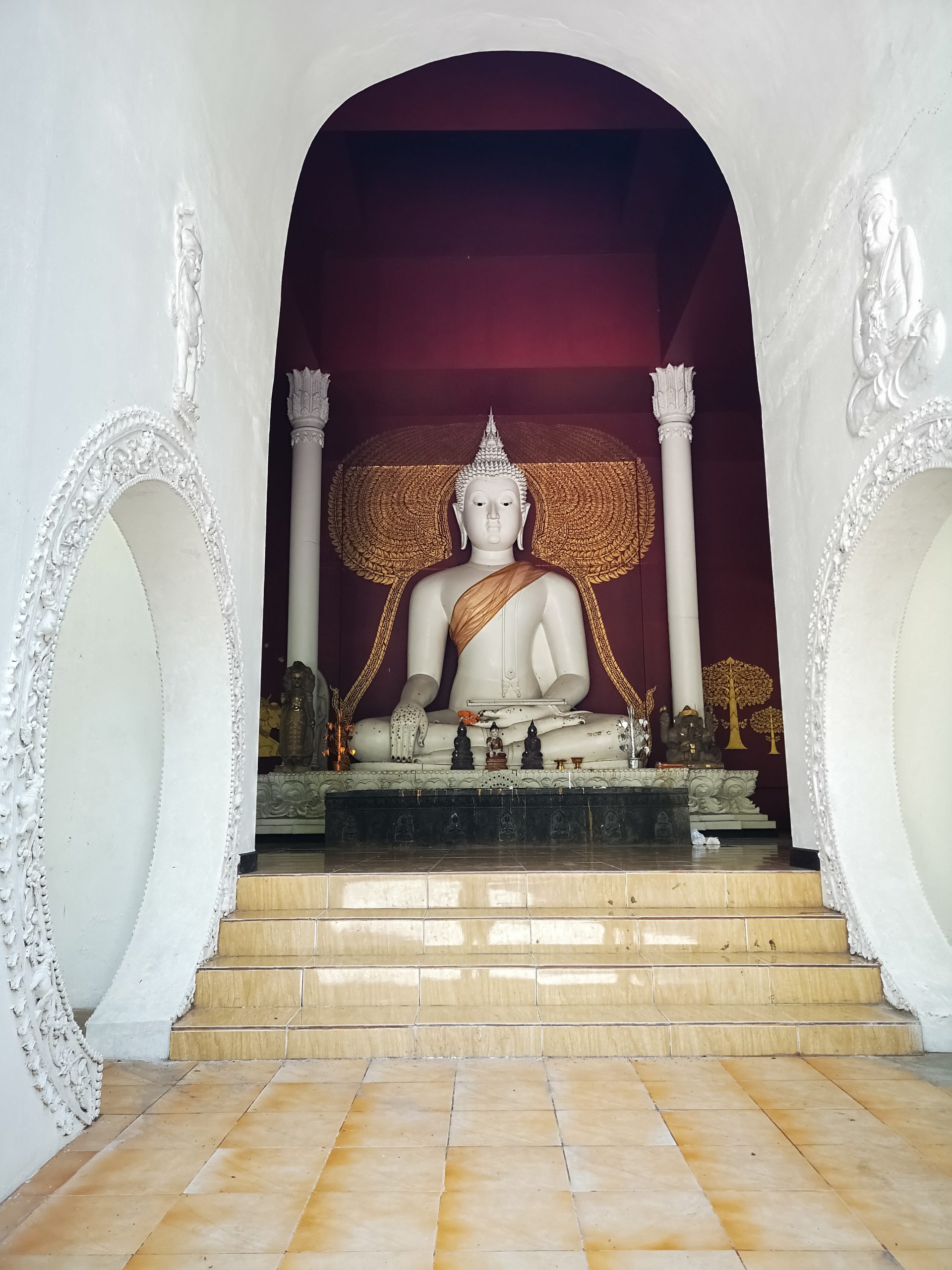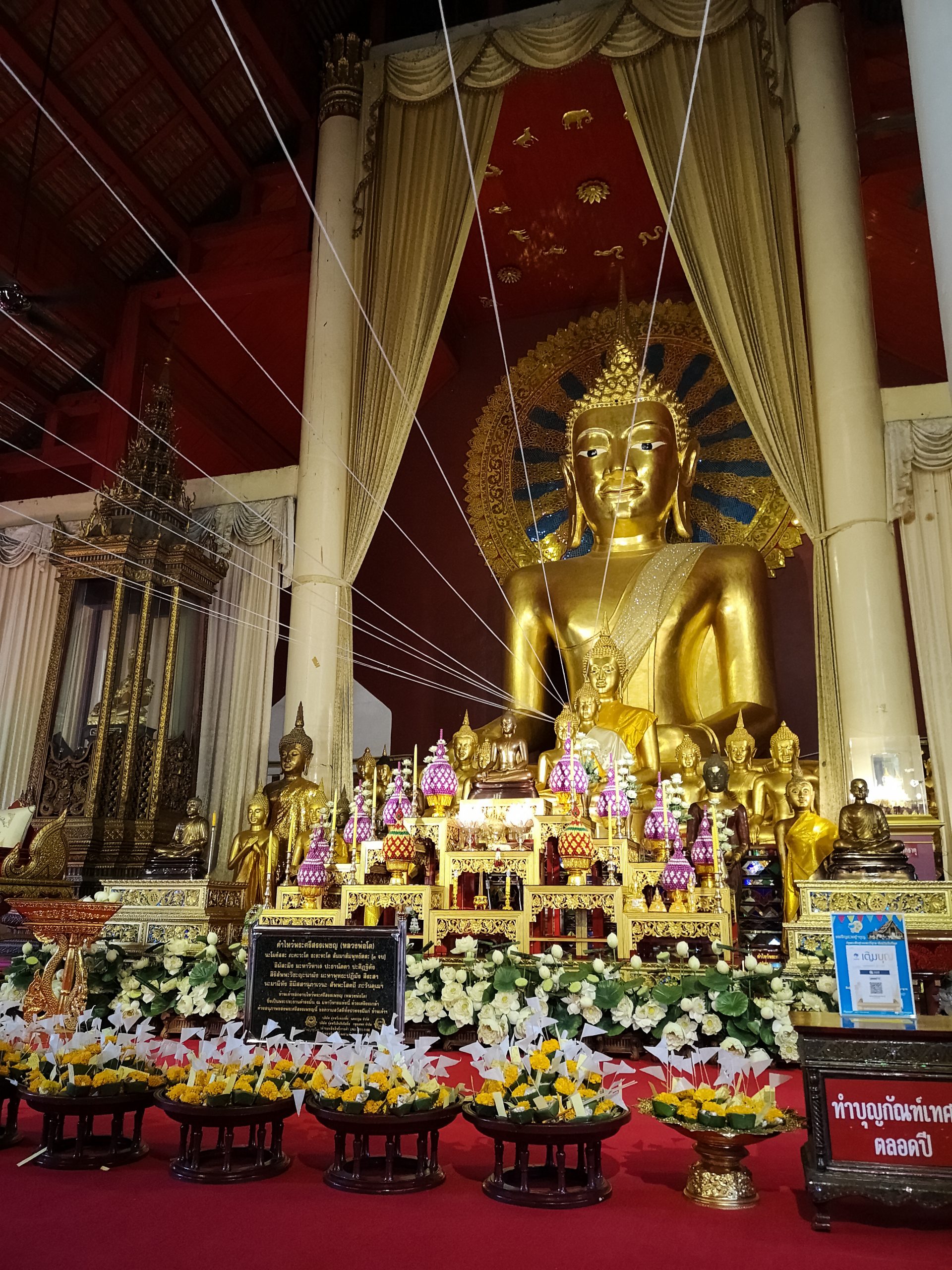 Sur le site se trouve une terrasse avec la légendaire statue de l’éléphant blanc qui portait, jadis, la relique de Bouddha. Plusieurs petits sanctuaires gravitent autour de la cours principale. Le plus important d’entre eux est celui du Chedi : haut de 24 mètres il est entièrement plaqué or. Les fidèles peuvent se recueillir devant les bouddhas situés à chaque angle mais aussi devant le bouddha allongé et le bouddha d’émeraude.