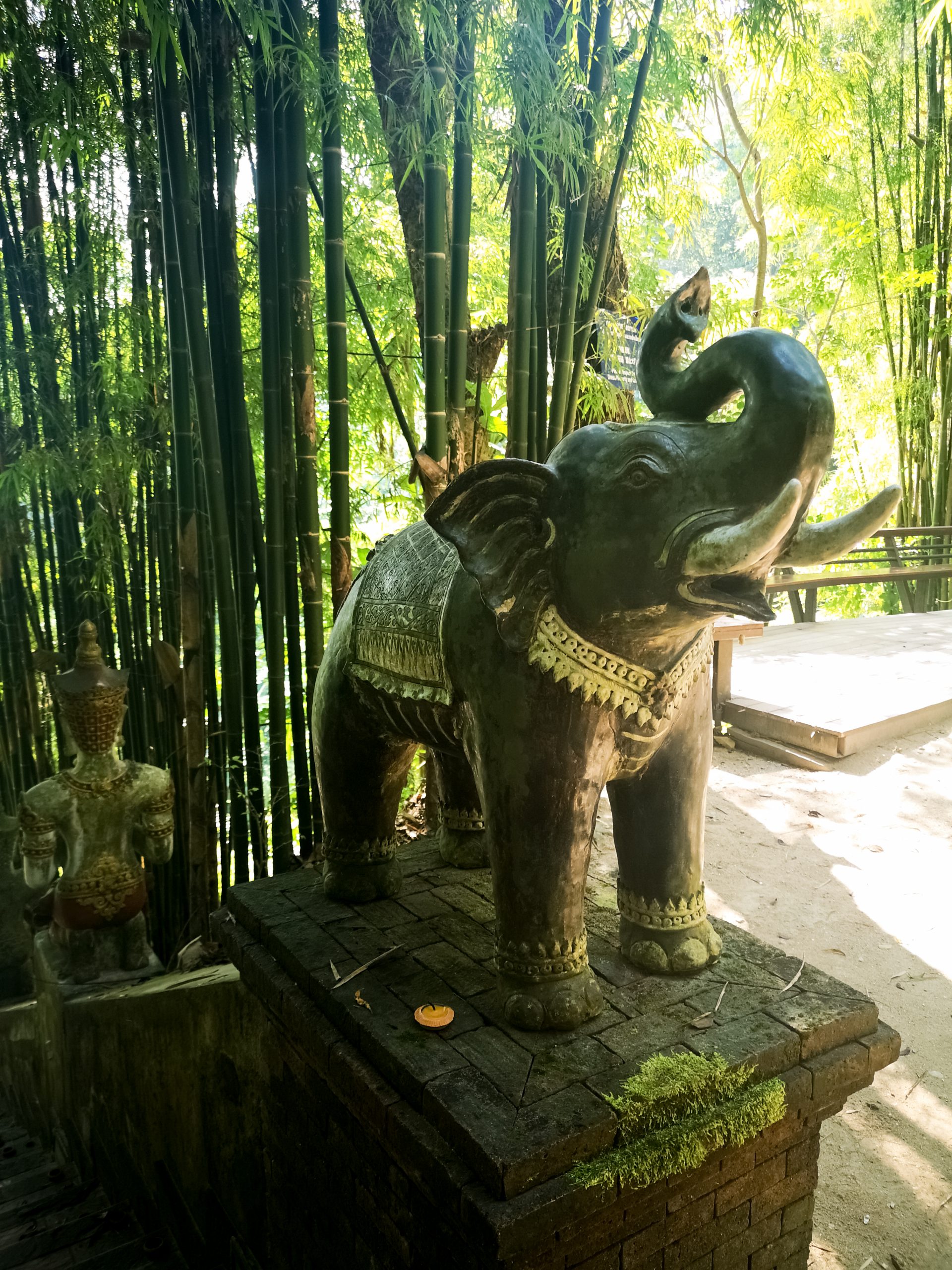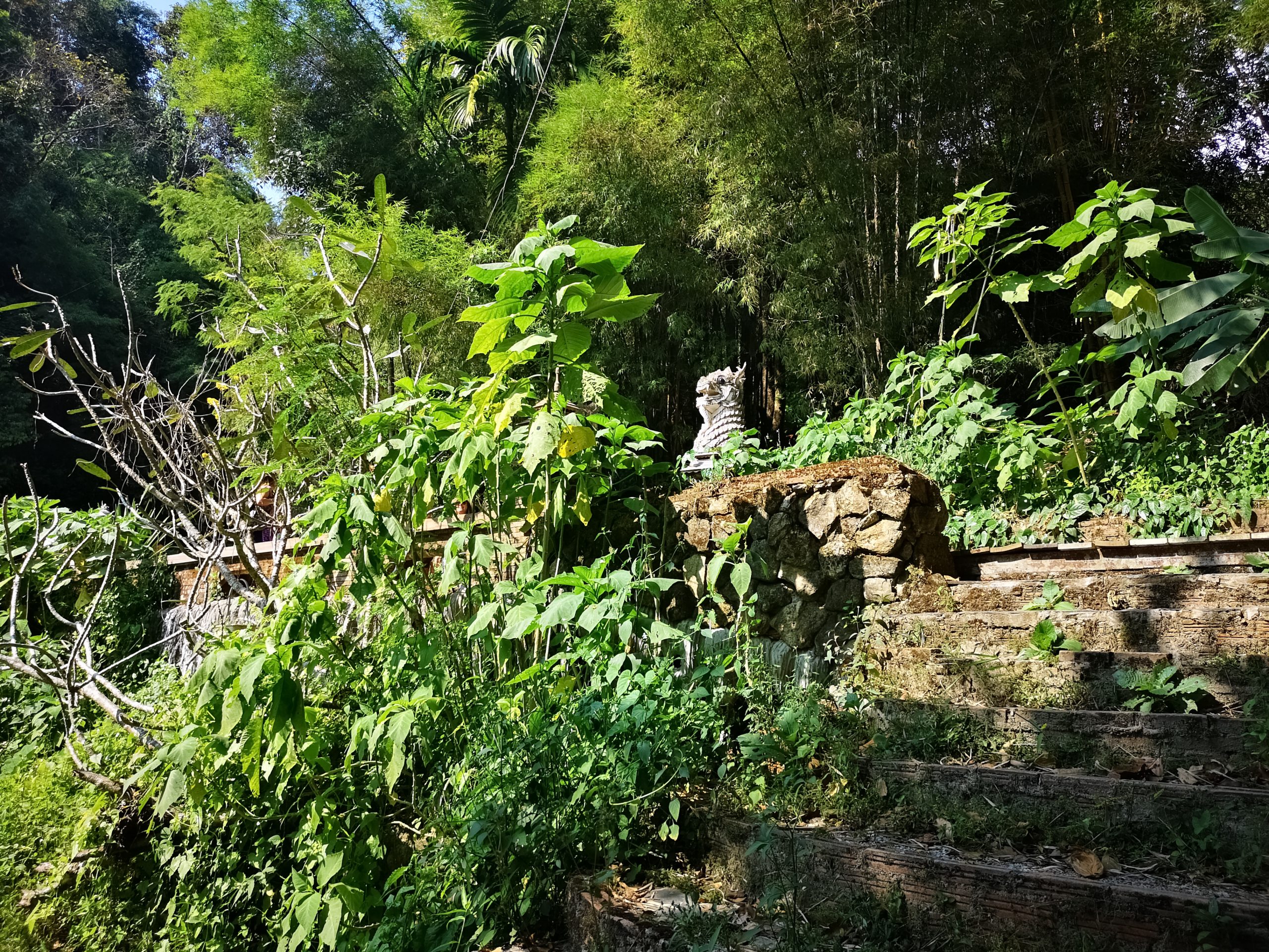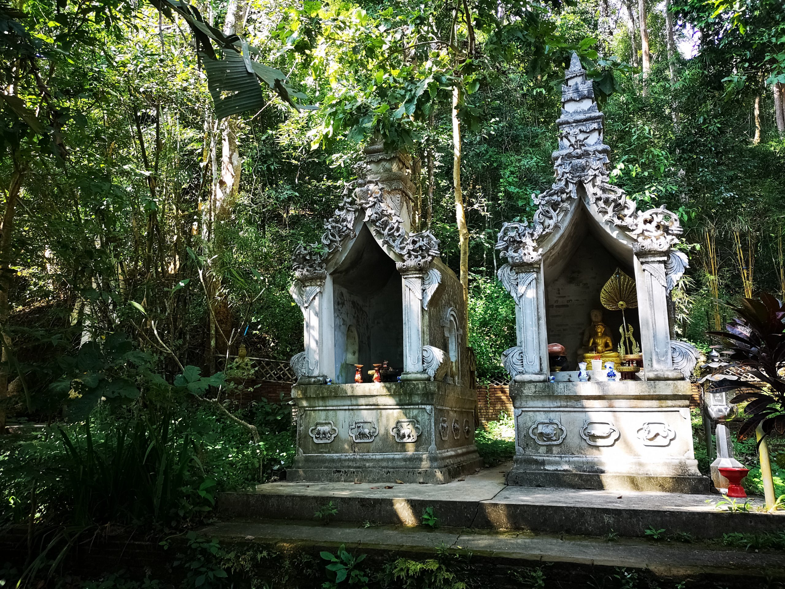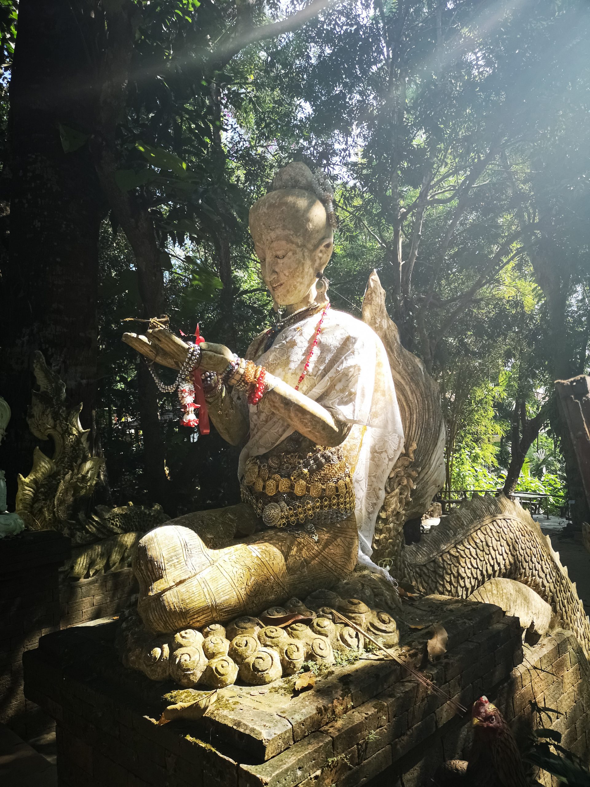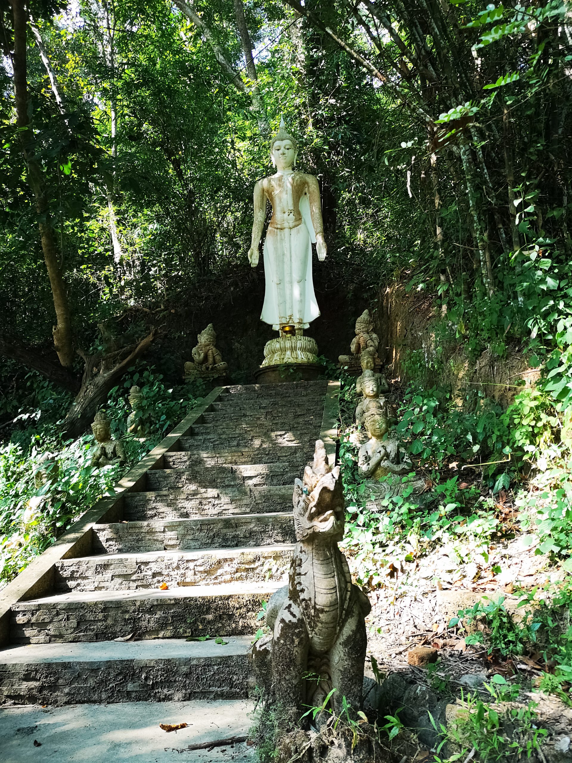 Situé en hauteur, on fait une halte au temple « Pha Lat ». Caché dans la végétation, l’environnement est paisible et serein. On y découvre plusieurs statues de divinités, bouddha, sphinx, dragons qui veillent sur toute la vallée et offrent une atmosphère mystique.