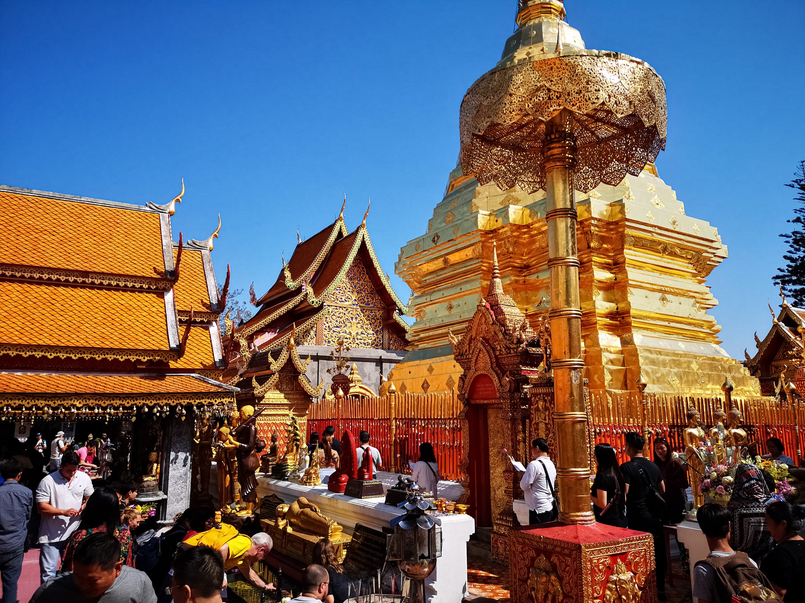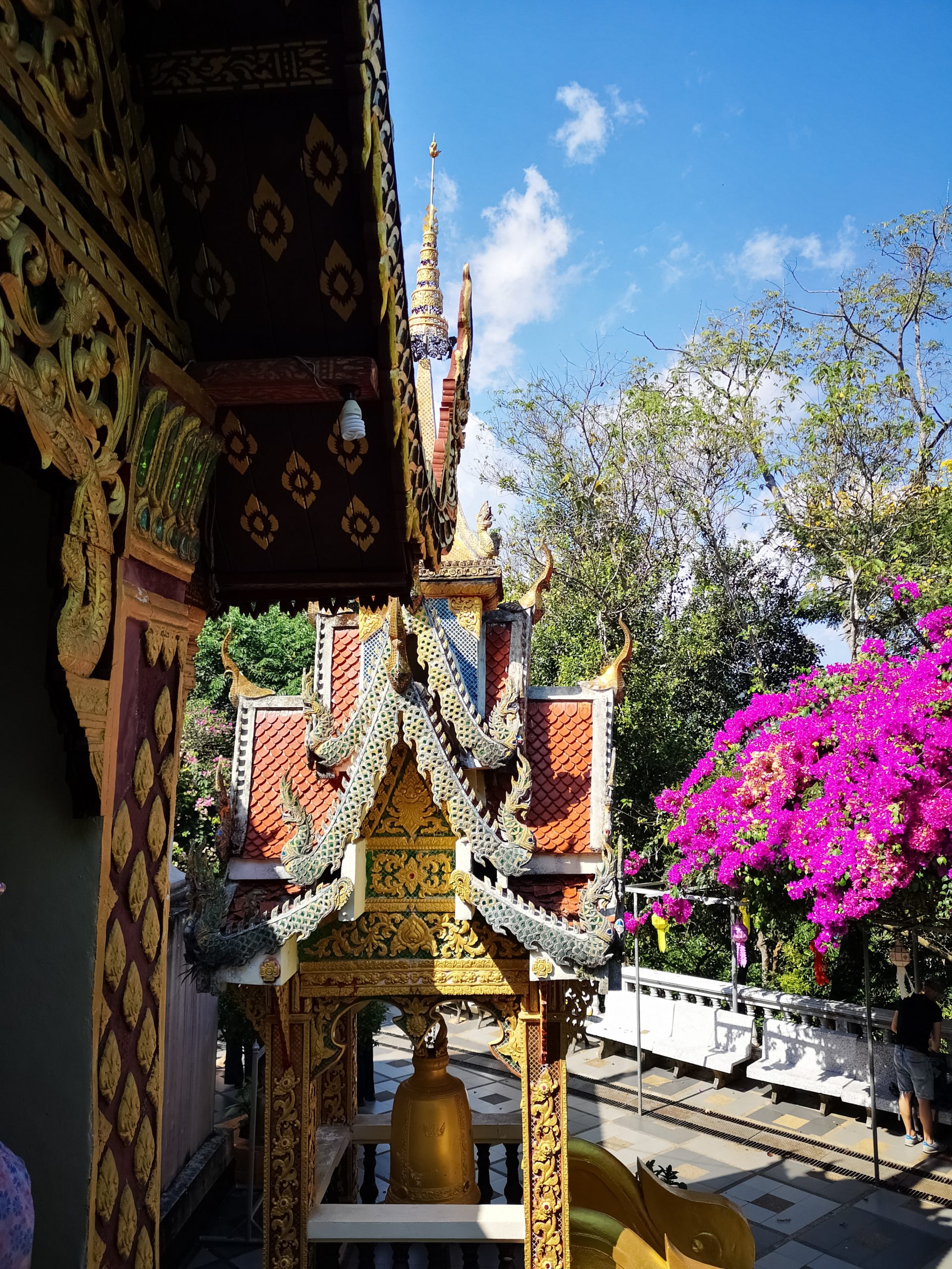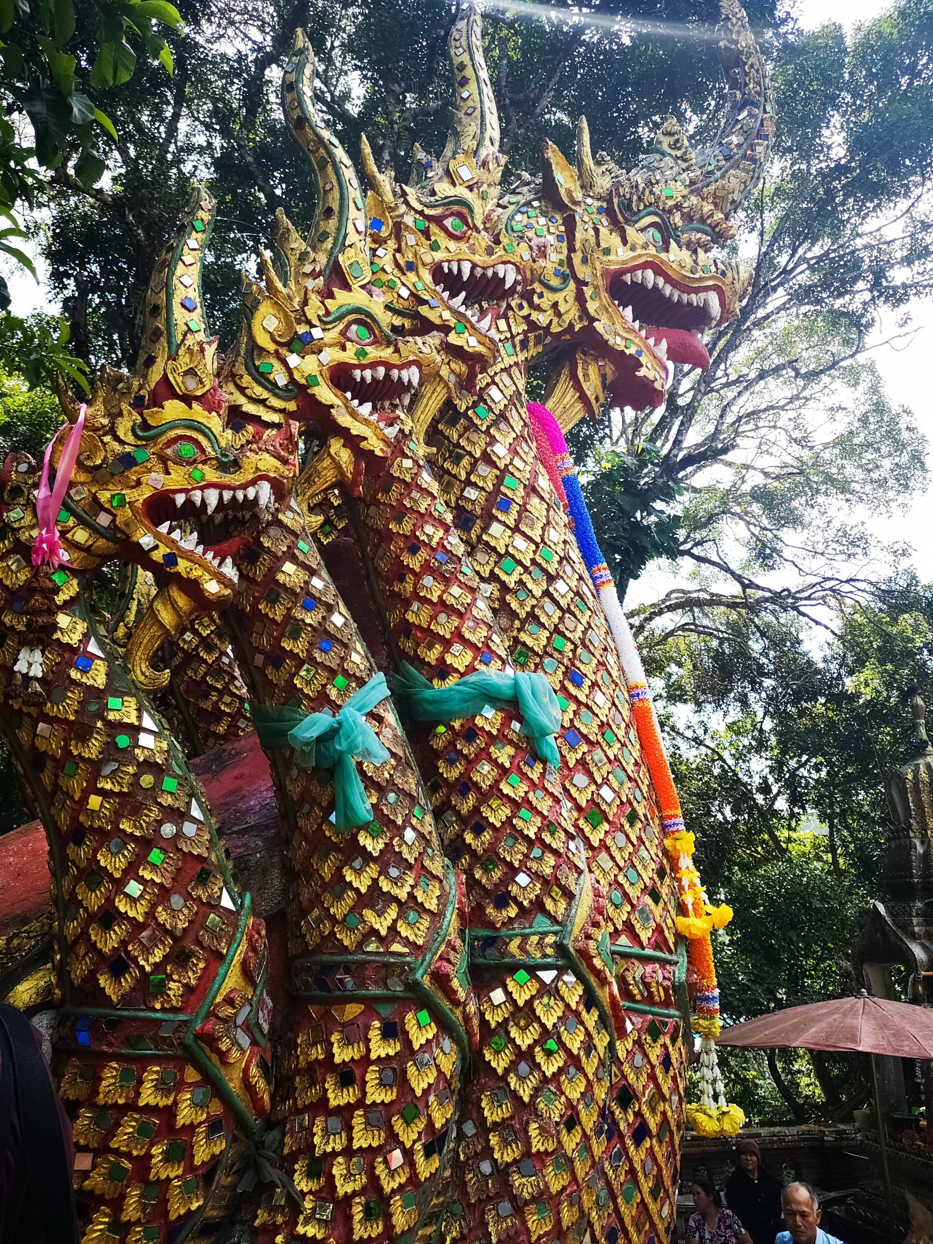 Nous continuons notre chemin en direction de Doi Suthep. Il est 12h00 quand nous arrivons à l’entrée du temple. La foule est au rendez vous et beaucoup de vendeurs ambulants sont présents devant.
