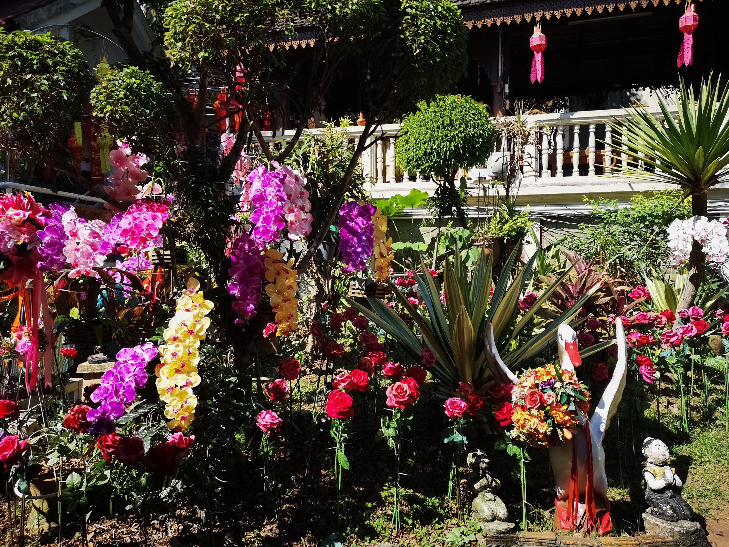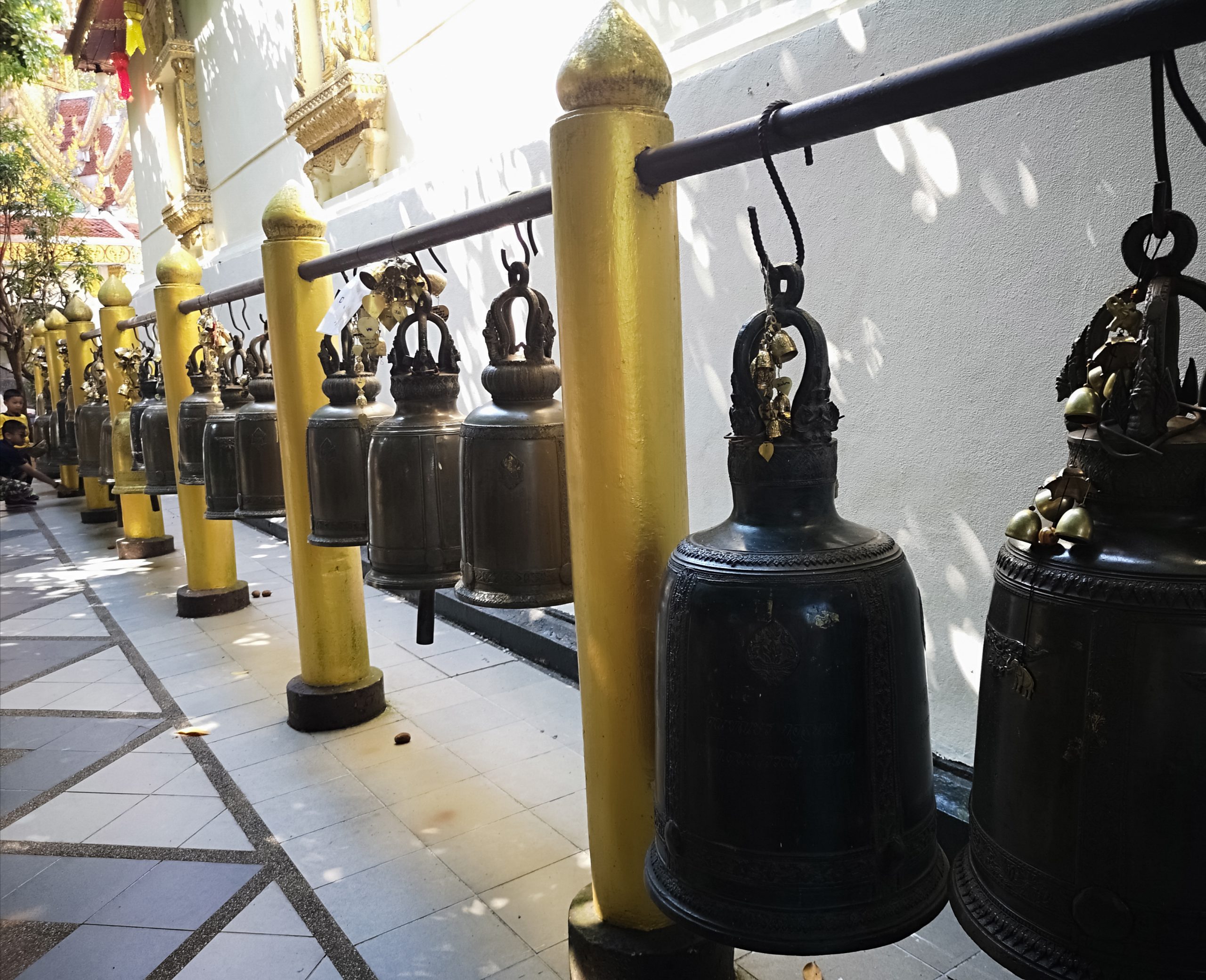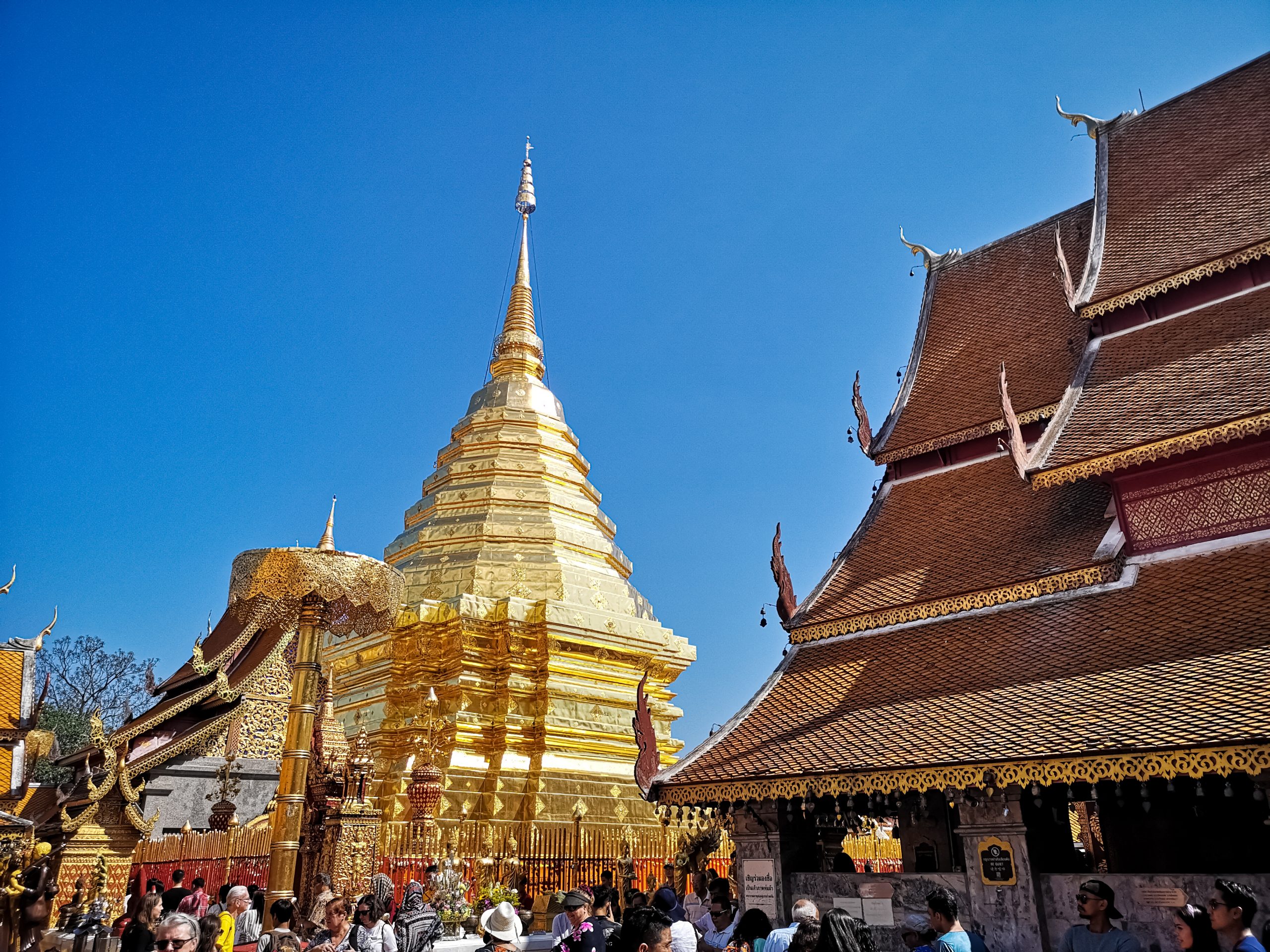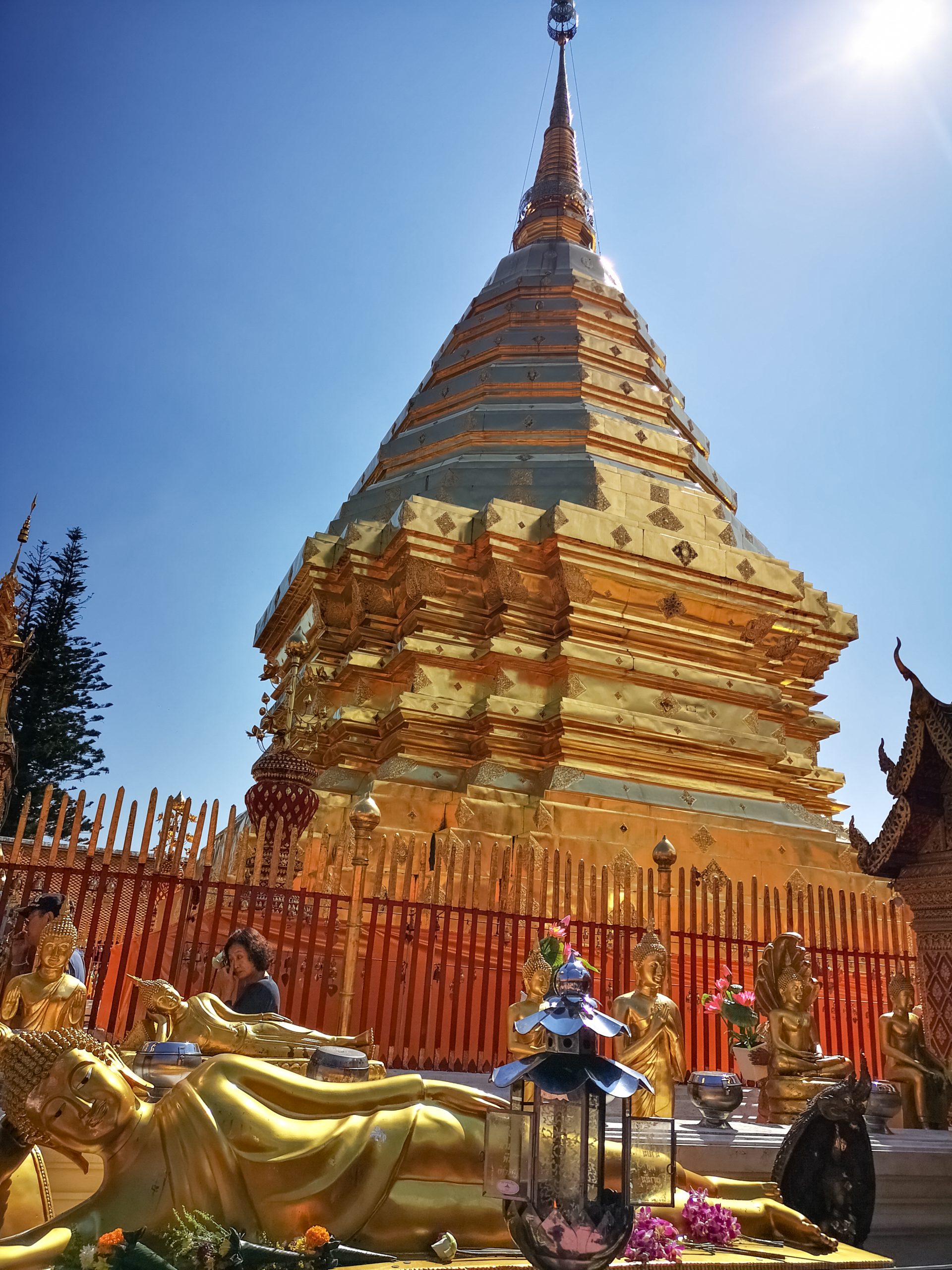 Nous continuons notre chemin en direction de Doi Suthep. Il est 12h00 quand nous arrivons à l’entrée du temple. La foule est au rendez vous et beaucoup de vendeurs ambulants sont présents devant.