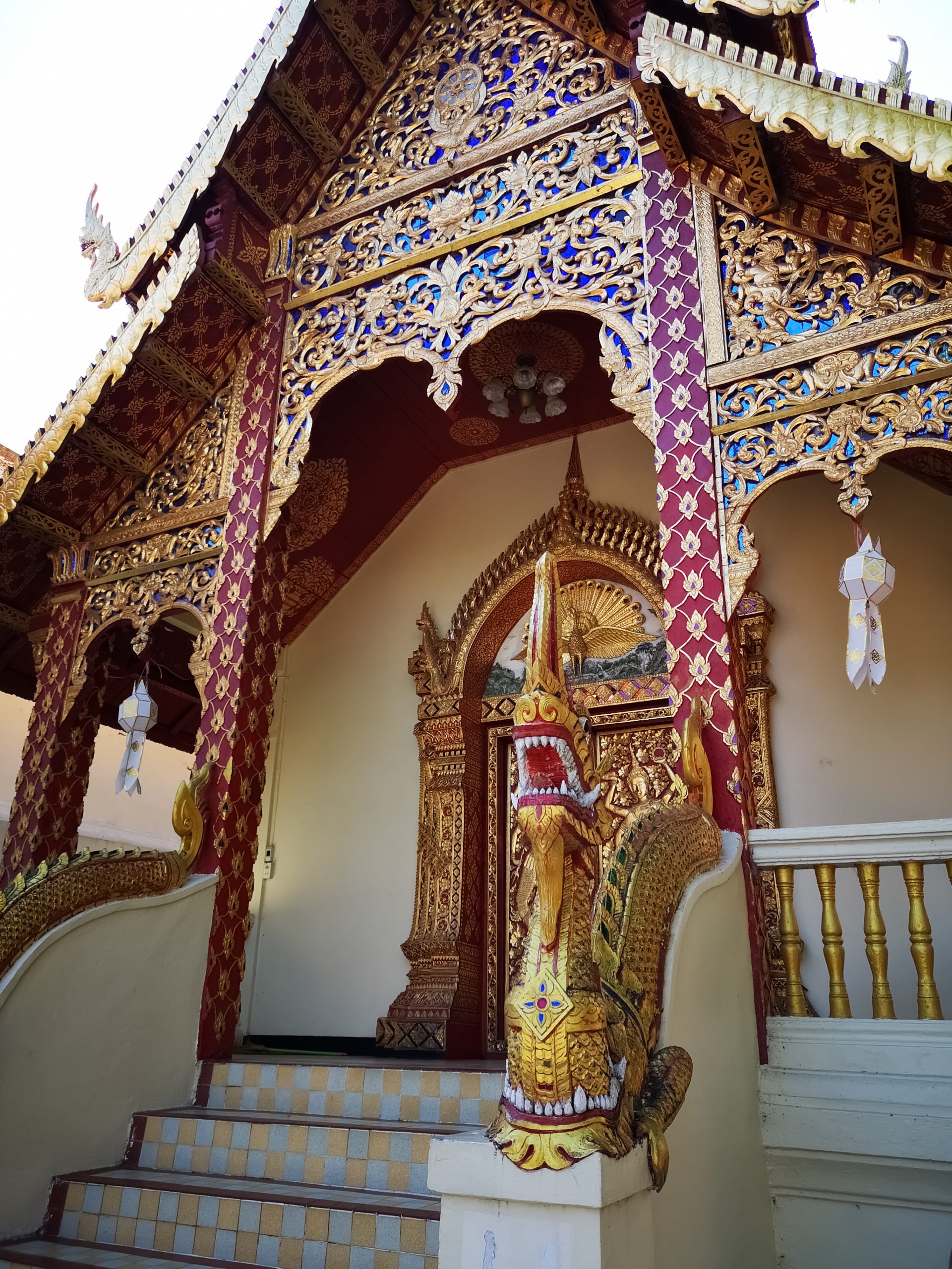 Pour accéder à l’enceinte du site, il faut gravir les quelques marches que composent l’escalier gardé par deux dragons à plusieurs têtes. Au sommet, nous trouvons le guichet pour acheter nos billets. Et pour 100 Bath, nous avons accès à tout le site. Toutefois, il faut faire attention à la réglementation vestimentaire, vous devez bien couvrir vos jambes et vos épaules avant d’entrer.