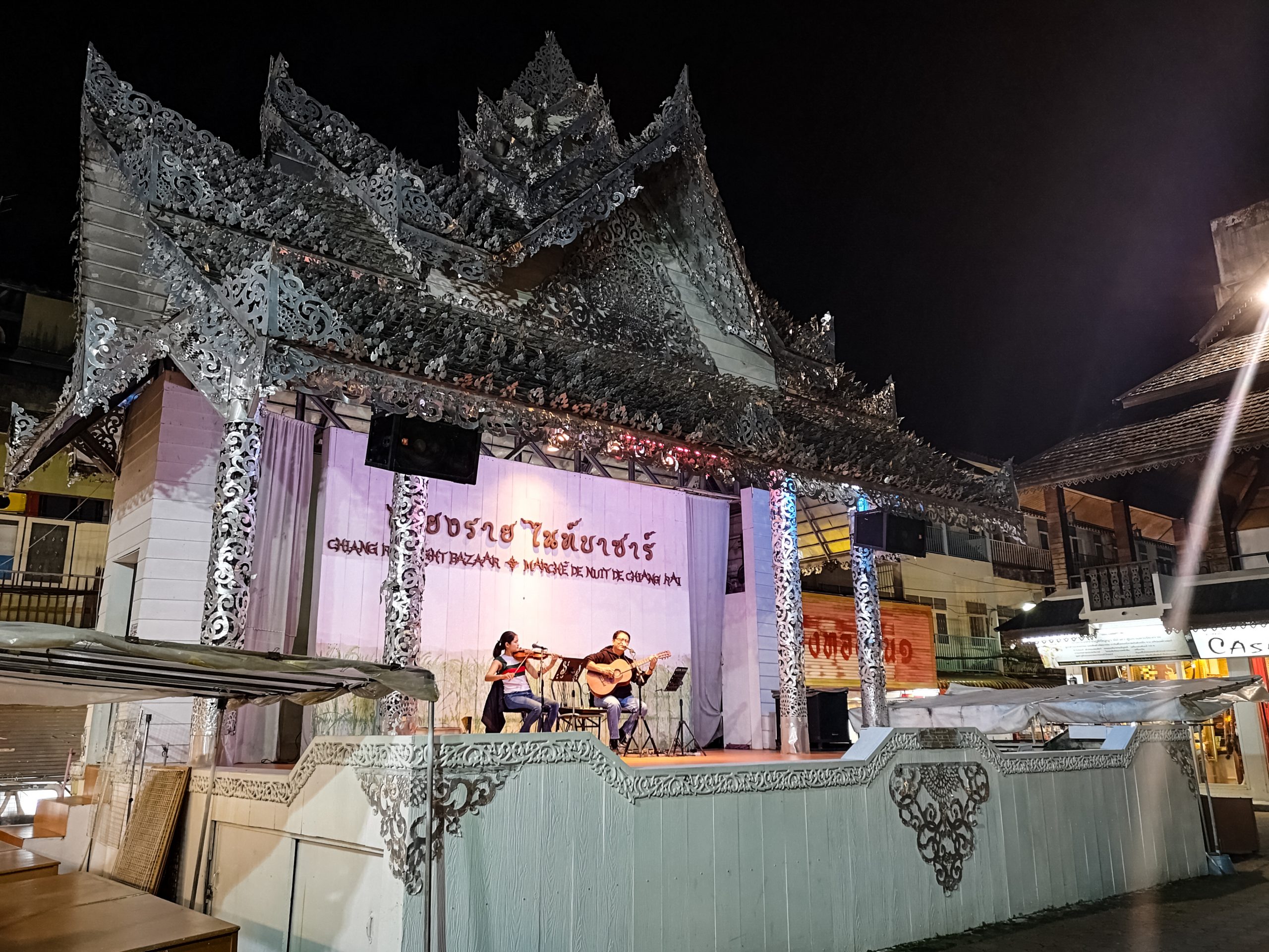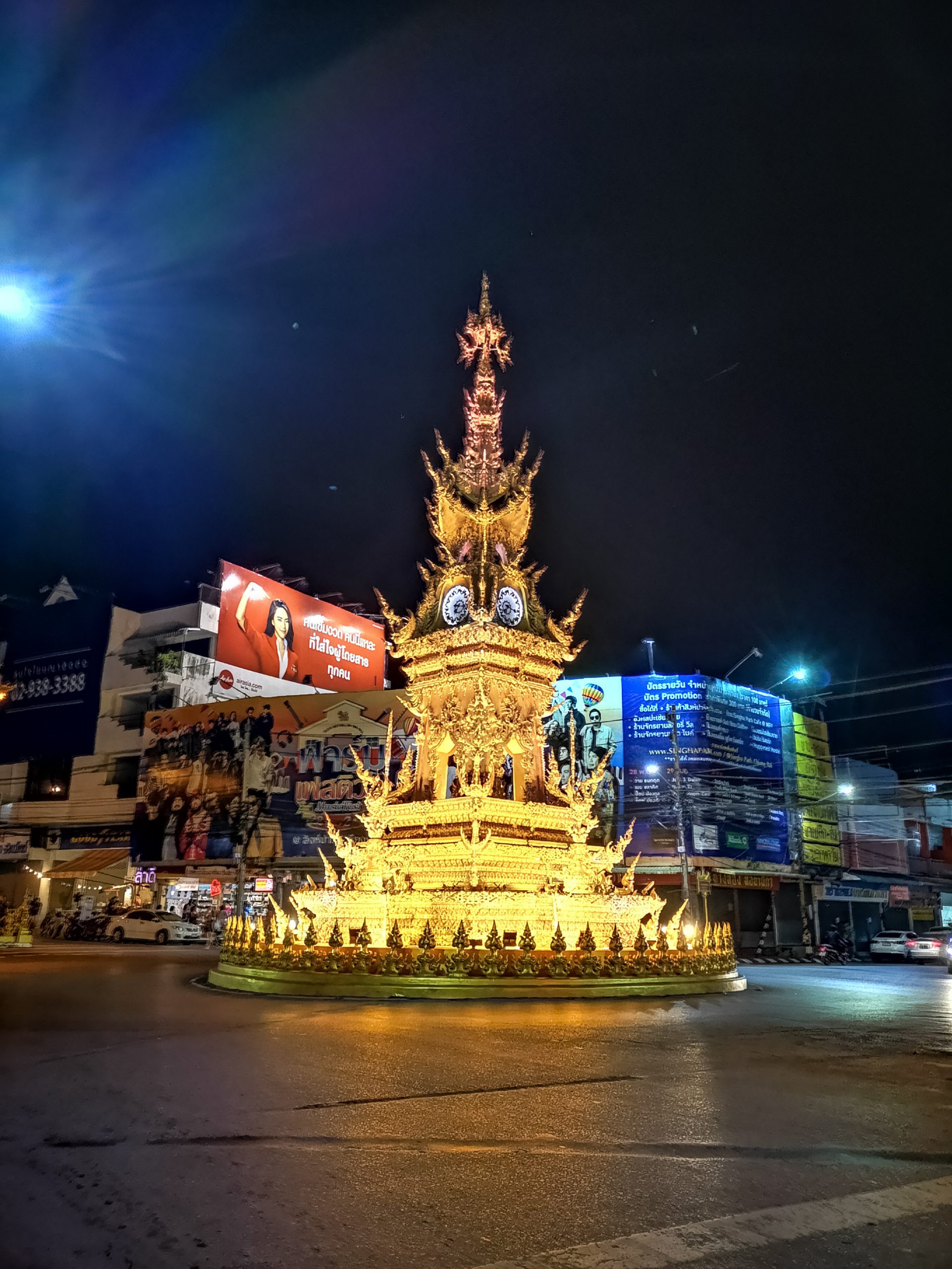 Le soir, nous partons visiter la ville de Chiang Rai de nuit. On sirote un verre de jus de coco dans un petit bar à coté de l’horloge « clock tower ». Situé à l’intersection de deux routes, celle-ci change de couleur à chaque heure.
