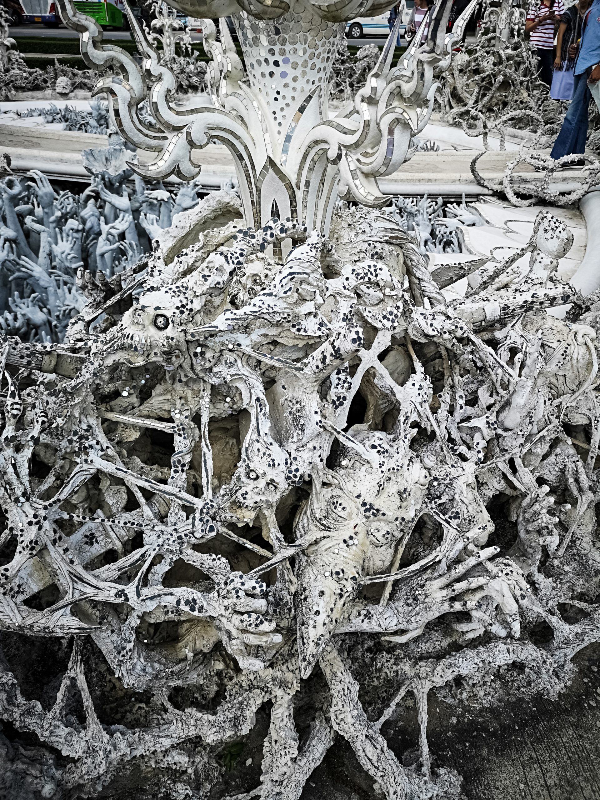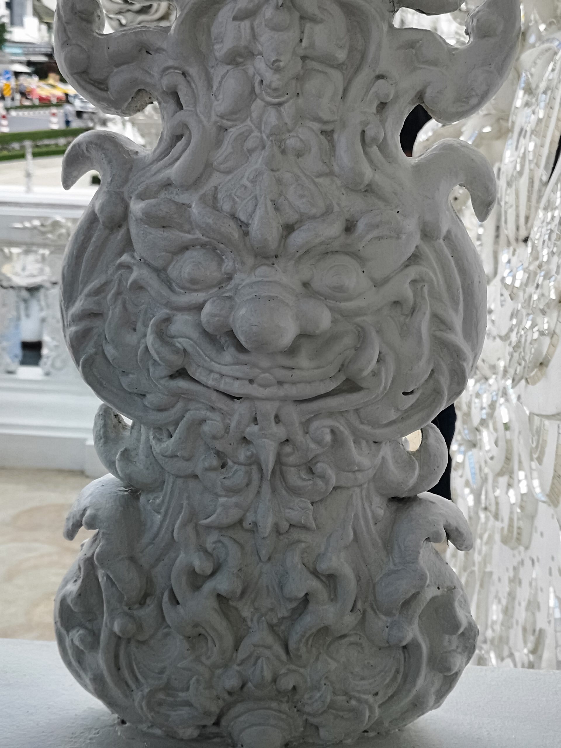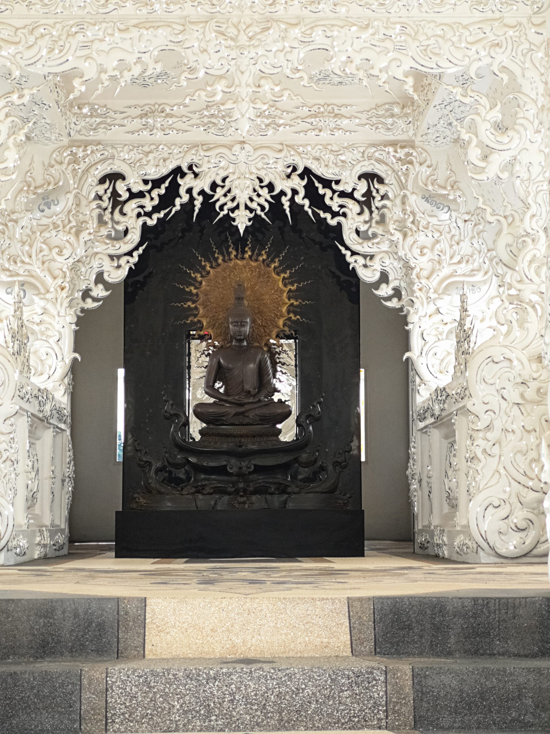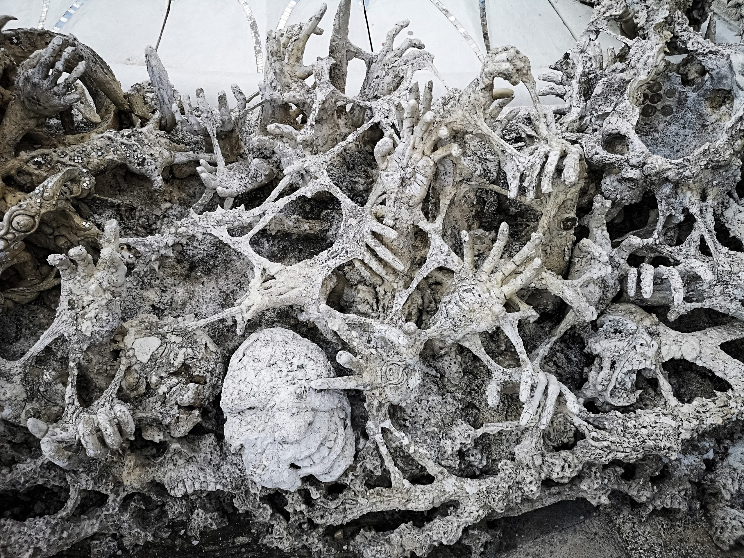 Au niveau du pont (pont du « cycle de la renaissance ») qui mène vers l’édifice principal, appelé Ubosot, on y trouve des mains et des crânes, représentation du désir et de la souffrance humaine. Après avoir traversé le pont, on accède aux portes du paradis guidés par des créatures mystiques. Plusieurs bouddhas sont représentés à l’extérieur du Ubosot et celui-ci reprend les codes de l’architecture classique des temples du nord.