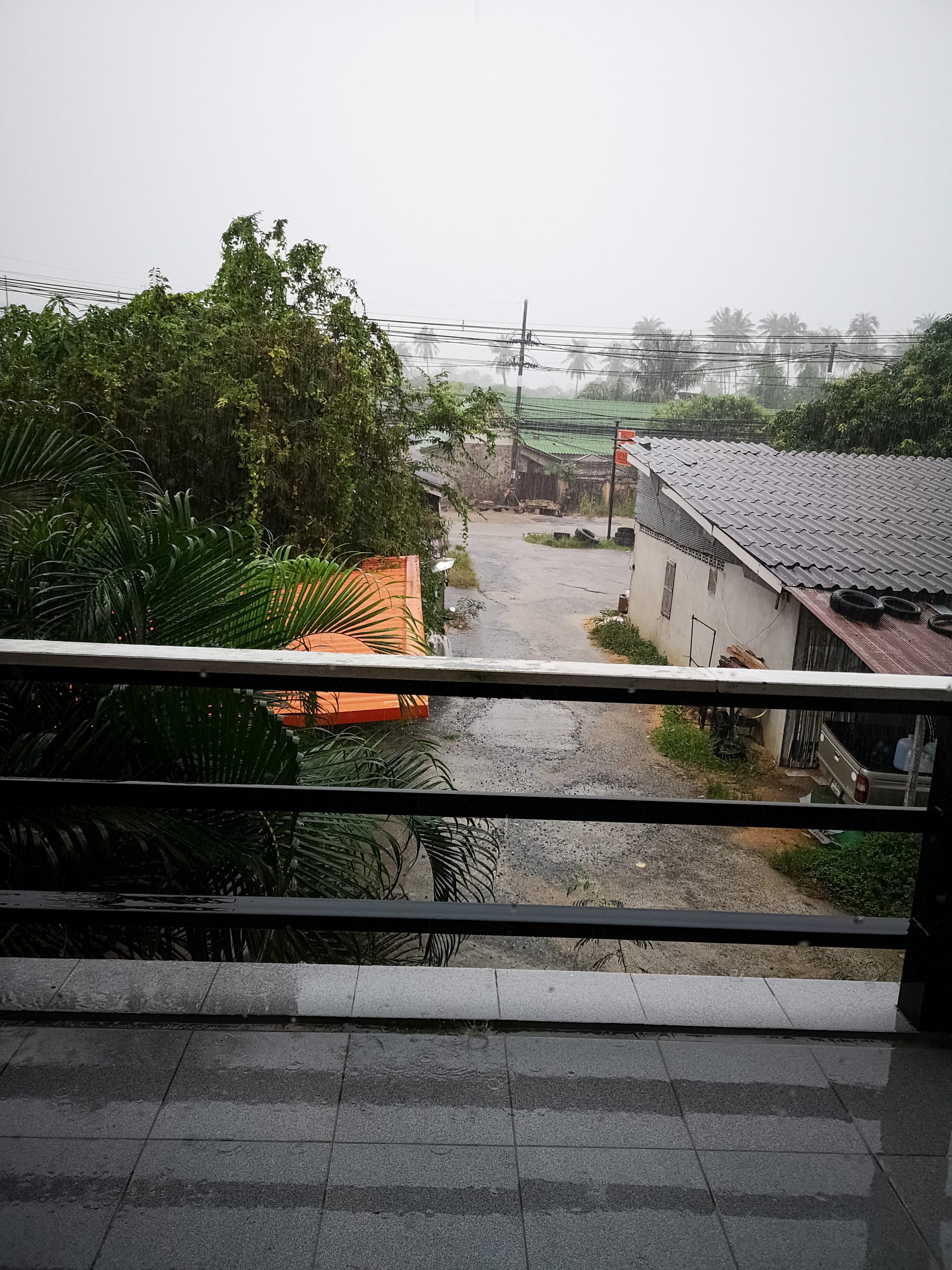 Nous retournons à pied à notre logement mais la pluie arrive et ce n’est pas que quelques goutes. on arrête un songteaw qui nous dépose devant notre appartement et nous voilà au sec.