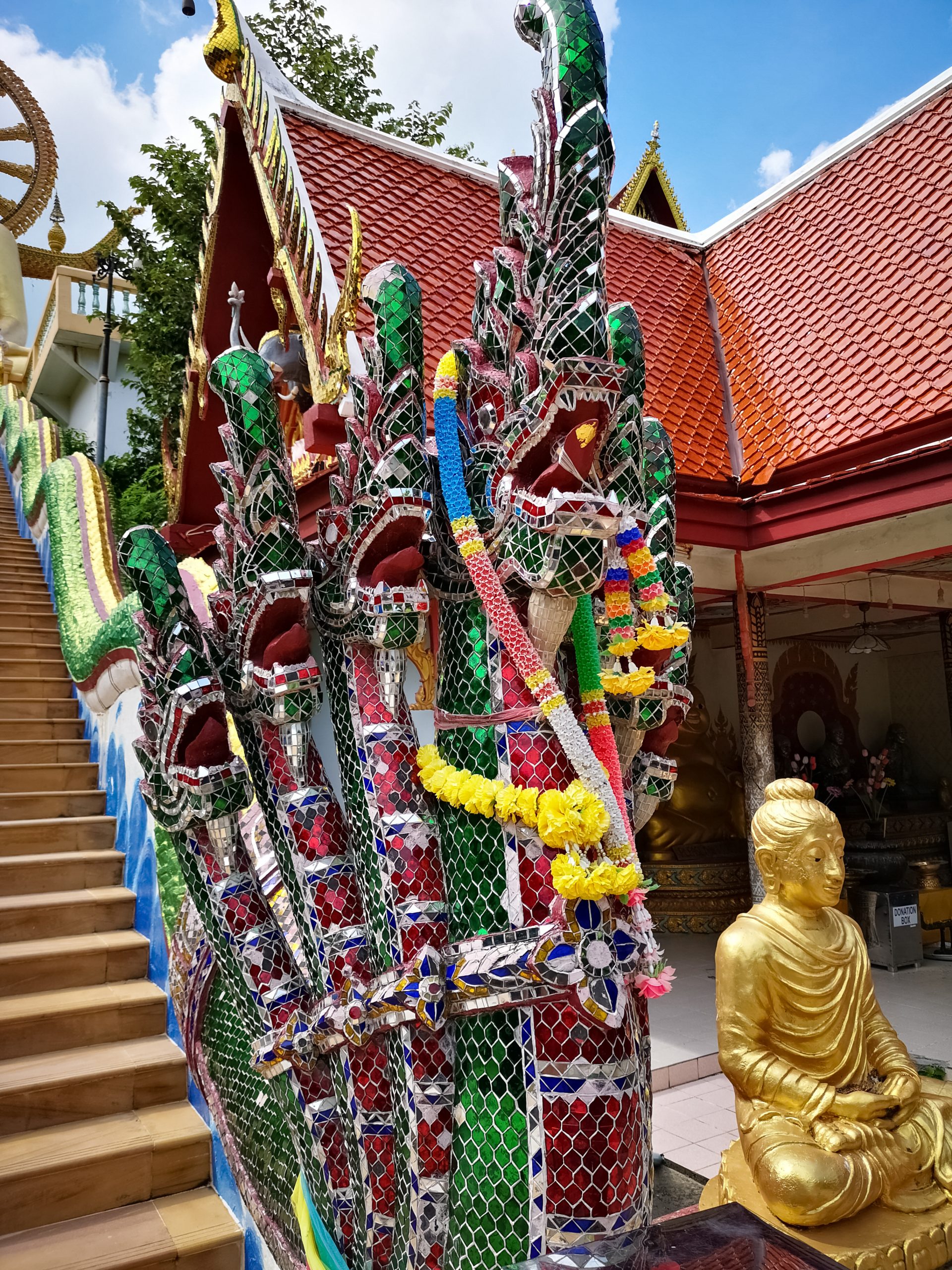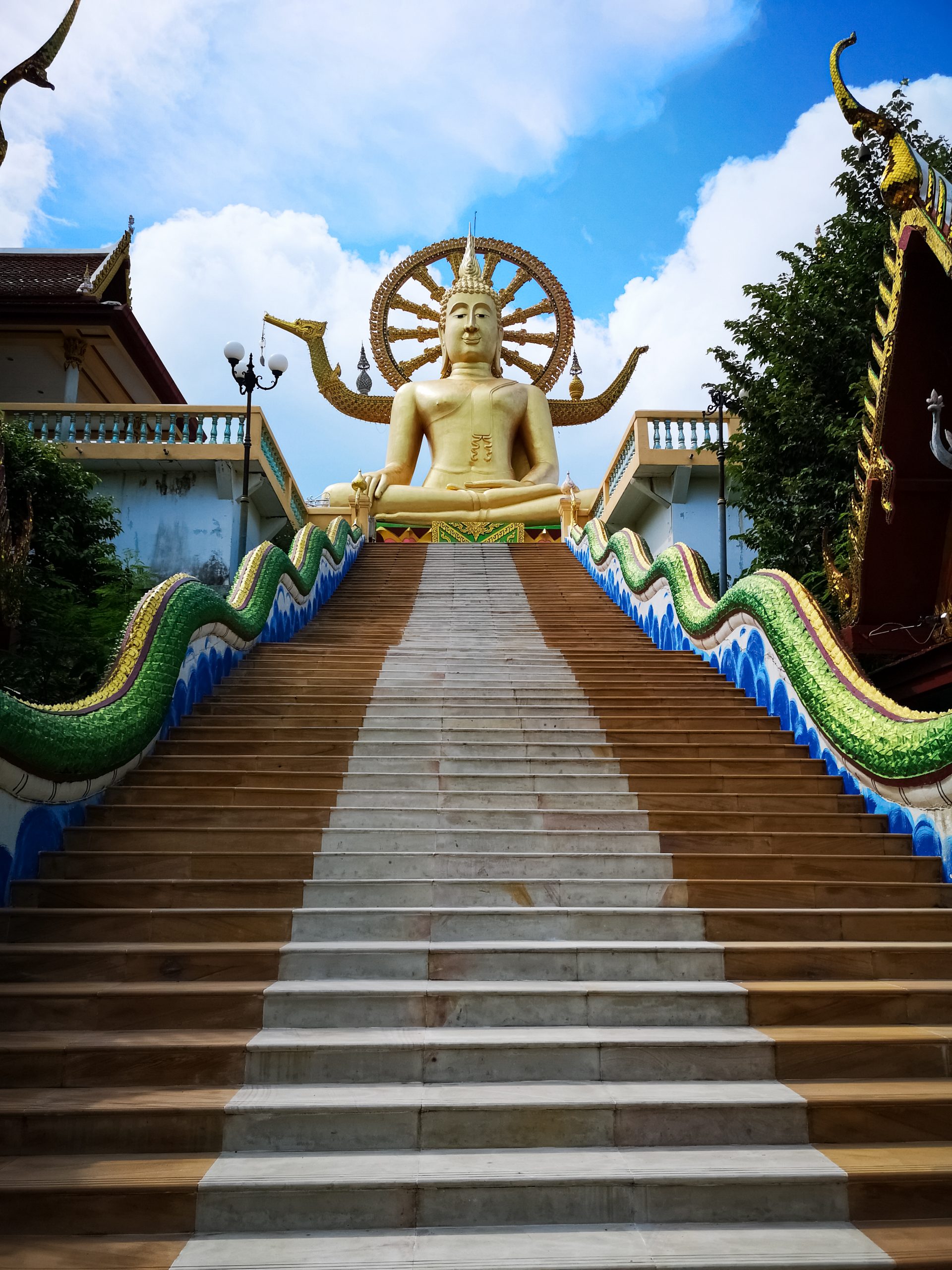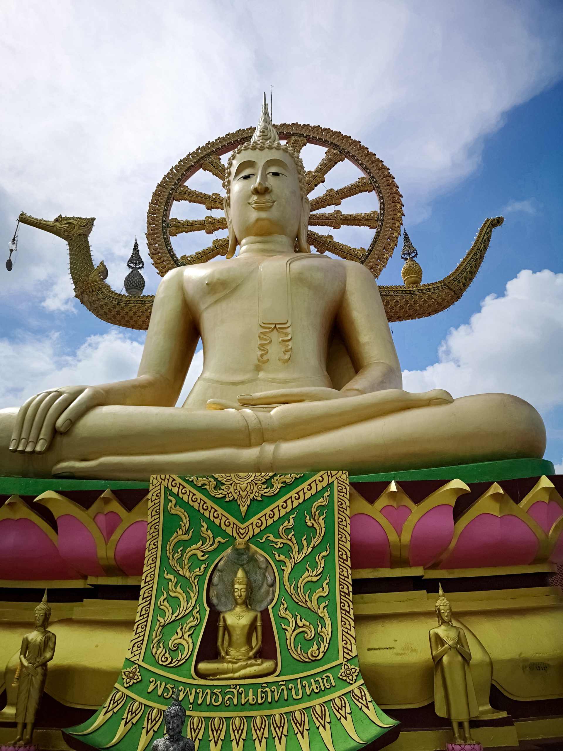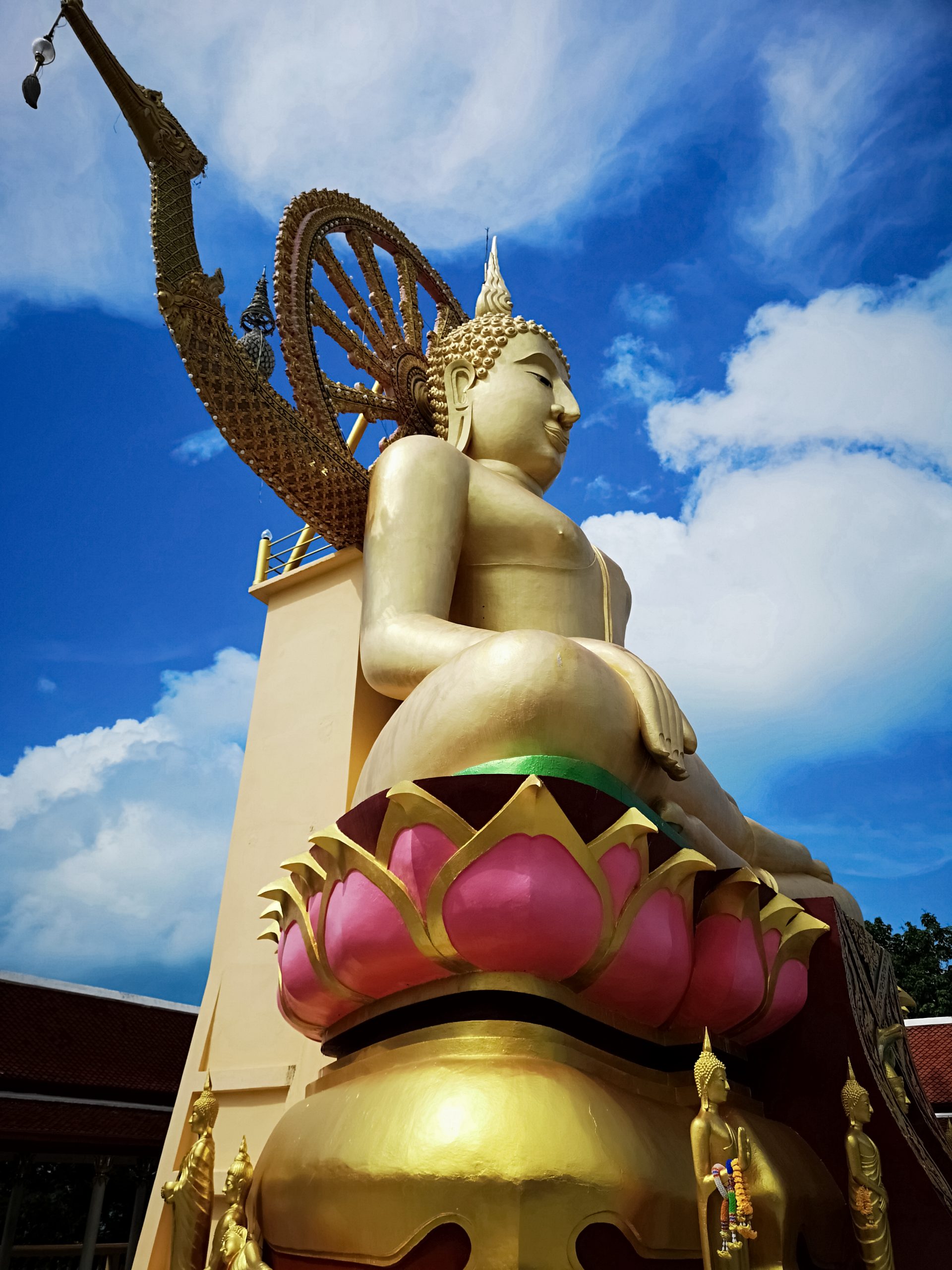 Le lieu à la fois calme et serein, se compose en sont centre de la statue de bouddha. Il se présente face à vous lorsque vous montez les escaliers et s’accompagne à chaque extrémité un serpent a plusieurs têtes. Avec ces 12 mètre de haut et recouvert d’or, celui est visible à des kilomètre. Le big Bouddha fut construit en 1970 et placé sur une petite île appelé Koh Fan. Alors que le pont qui reliait la petite île à koh Samoui fut détruit à la fin des années 70, la décision de construire une chaussée fût instaurée.