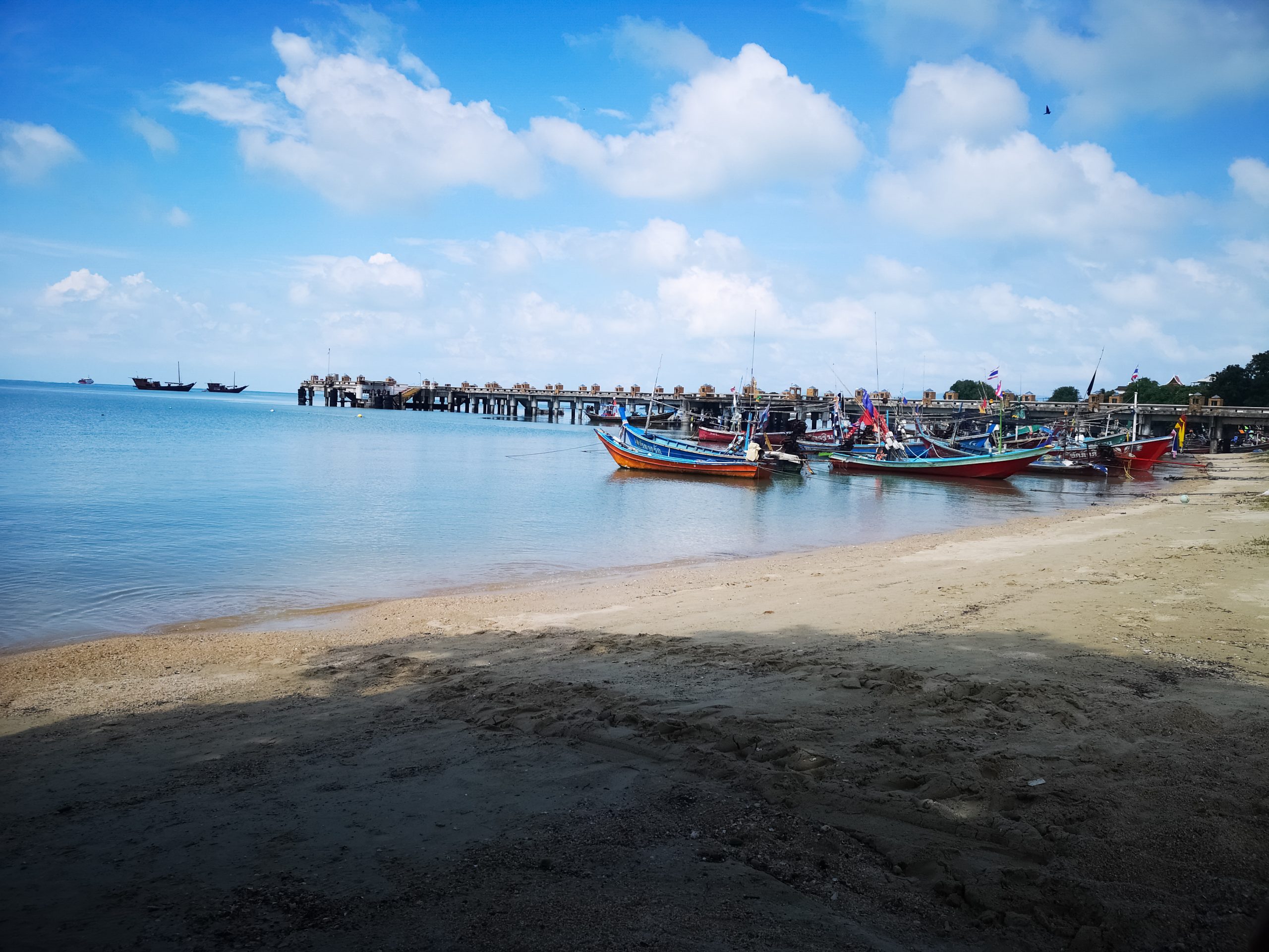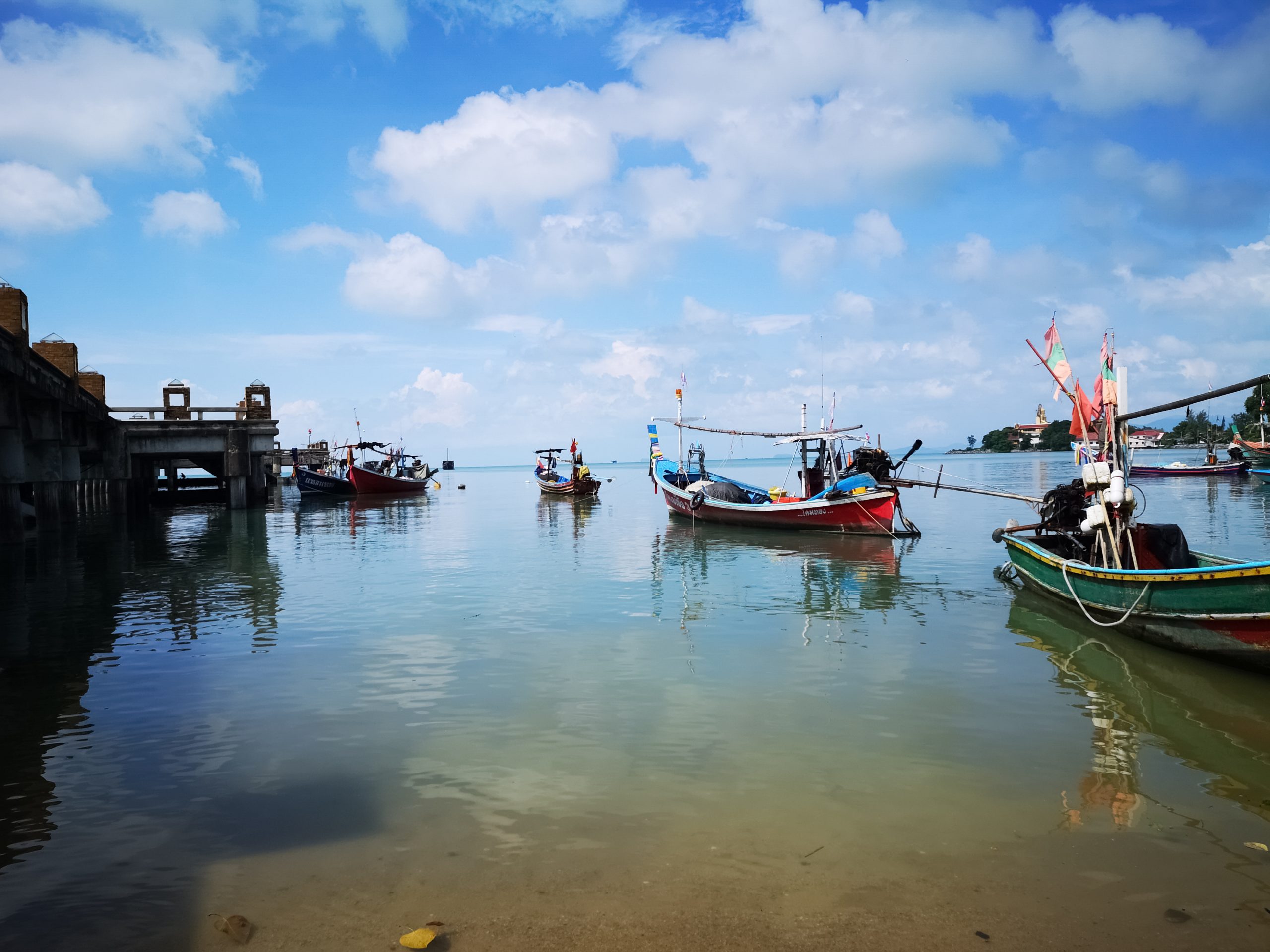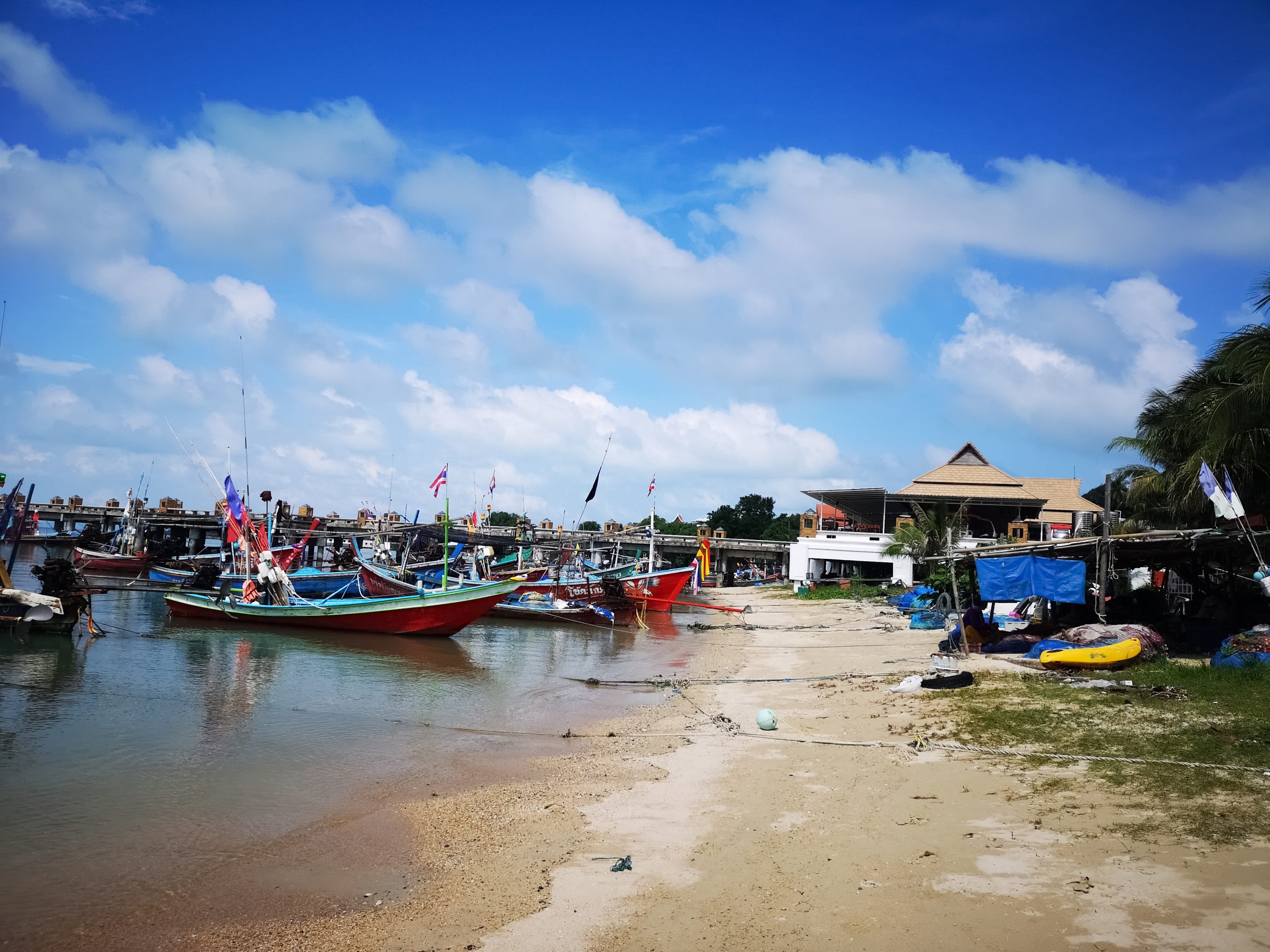 Alors que le beau temps est au rendez vous le 1er décembre, nous en profitons pour nous rendre à Wat Phra Yai (Big Bouddha) en longeant la côte. On y met 2h20 à pied. Sur la route, nous découvrons les petits ports, les pêcheurs avec leur filet et le marché aux poissons.