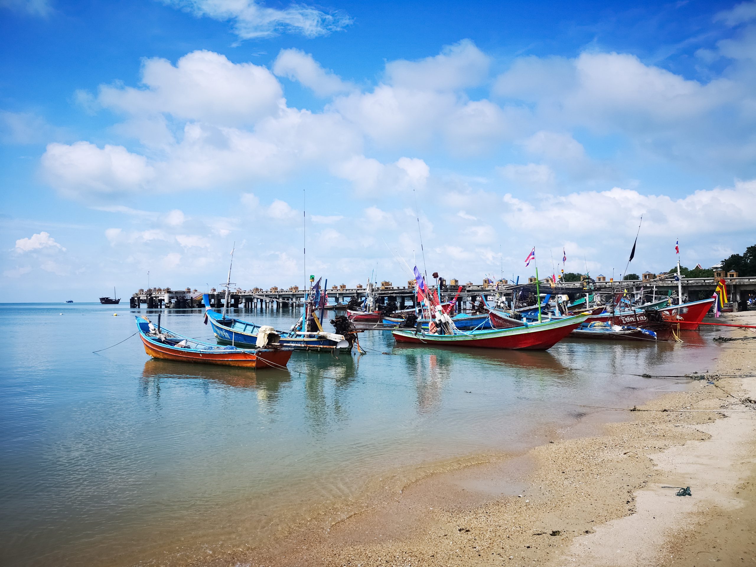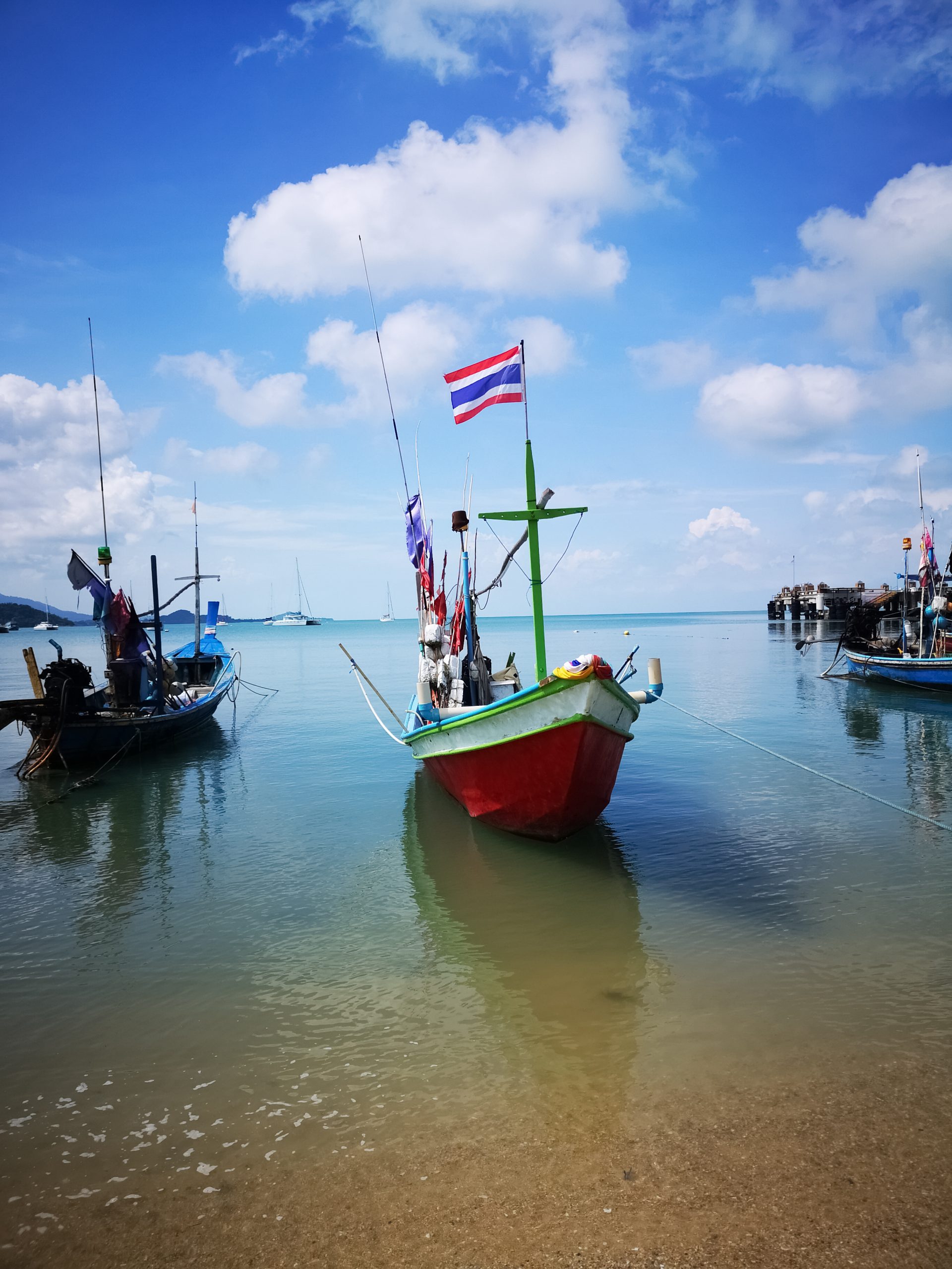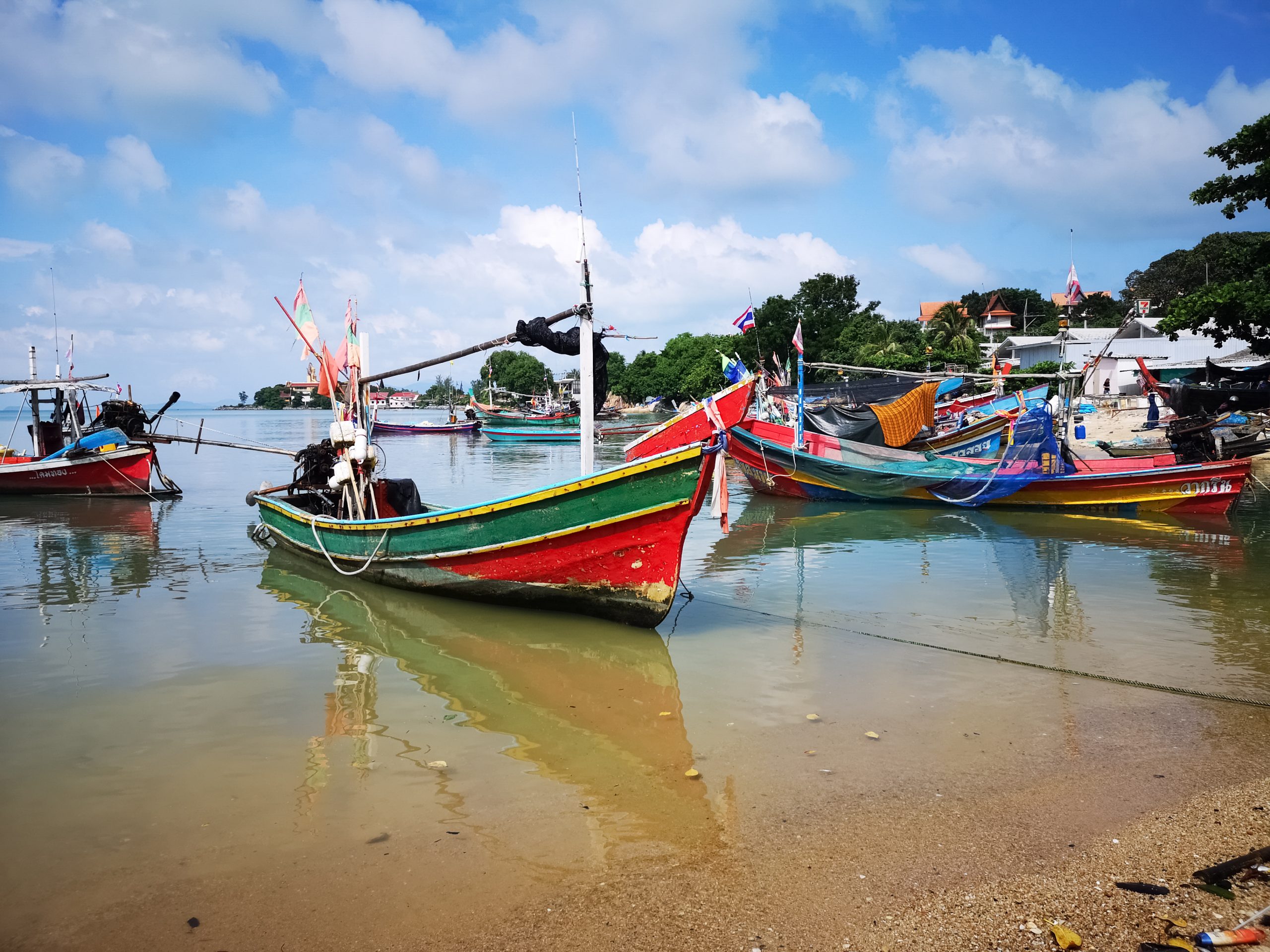 Alors que le beau temps est au rendez vous le 1er décembre, nous en profitons pour nous rendre à Wat Phra Yai (Big Bouddha) en longeant la côte. On y met 2h20 à pied. Sur la route, nous découvrons les petits ports, les pêcheurs avec leur filet et le marché aux poissons.
