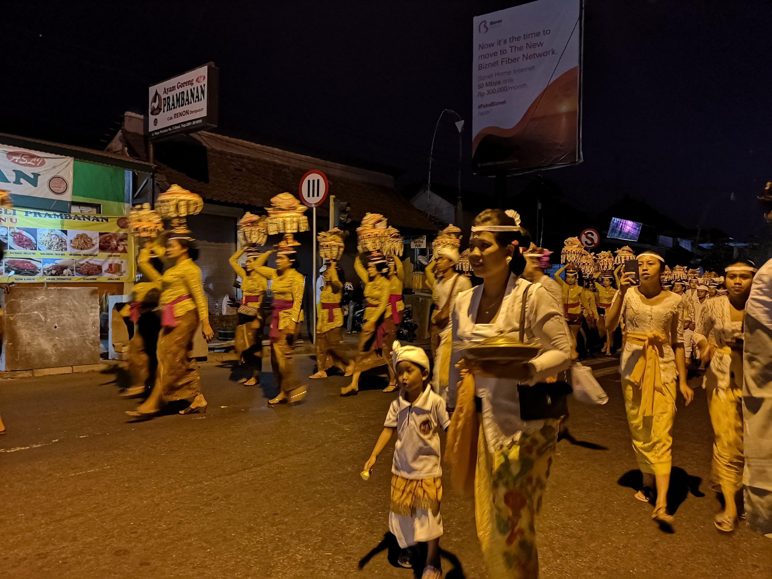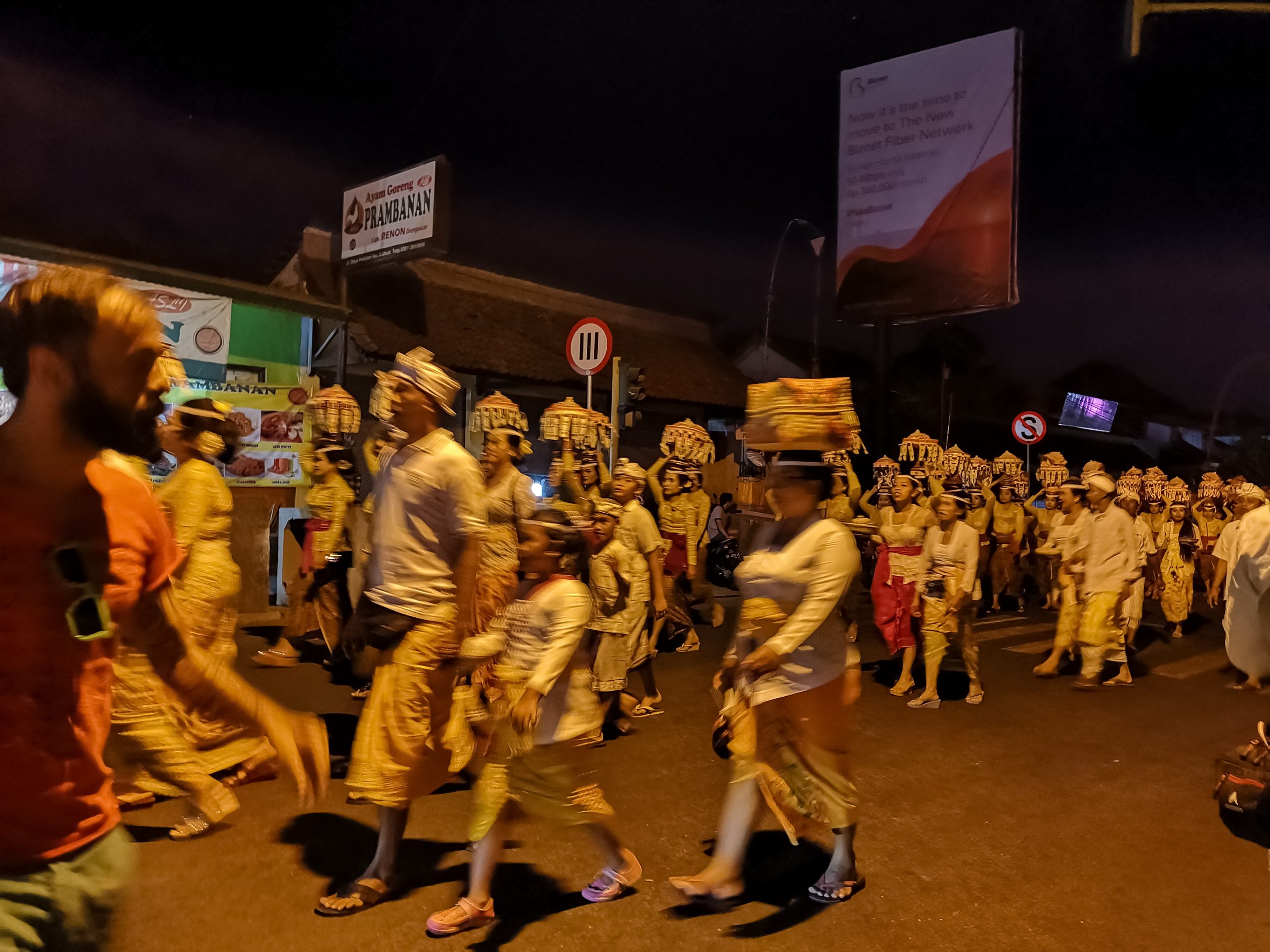 Nous avons profité une dernière fois des rizières aux alentours d’Ubud avec Guillaume et Solène. Un soir, alors que nous étions en route pour le centre-ville, nous sommes tombés dans une procession religieuse. Toutes la circulation d’un grand carrefour était interrompue . Je vous laisse imaginer la pagaille entre les voitures et les scooters.