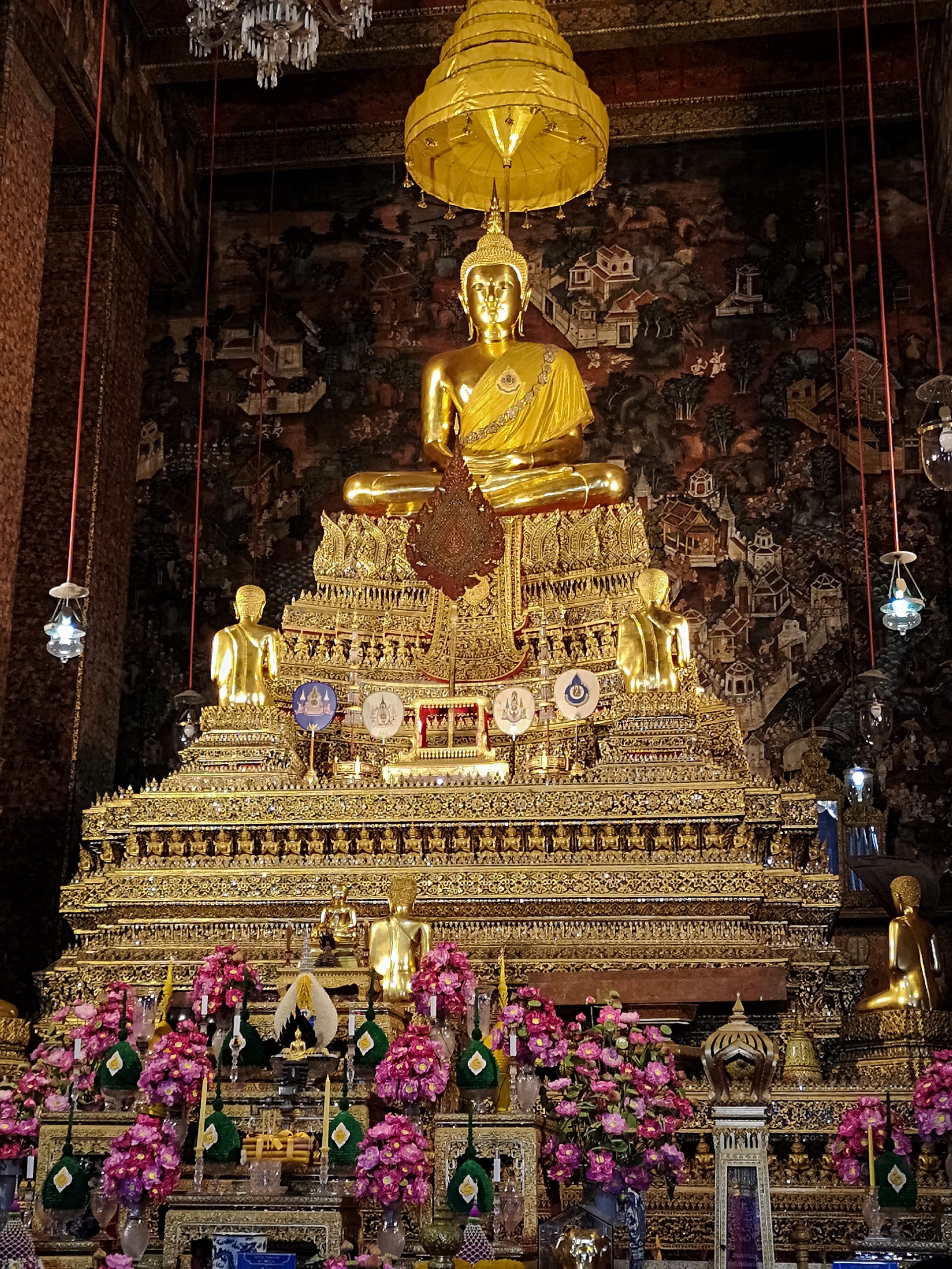 La statue la plus impressionnante du temple est le Phra Buddhasaiyas, dit: le Bouddha allongé. Construit en 1832 par le roi Rama II, elle fait 46 mètres de long et 15 mètres de haut. Ses pieds de 3m de hauteur et 4,5m de long sont incrustés de nacre avec la représentation des 108 états de Bouddha. Avec ces mensurations, elle est l’une des plus grandes statue de la Thaïlande.