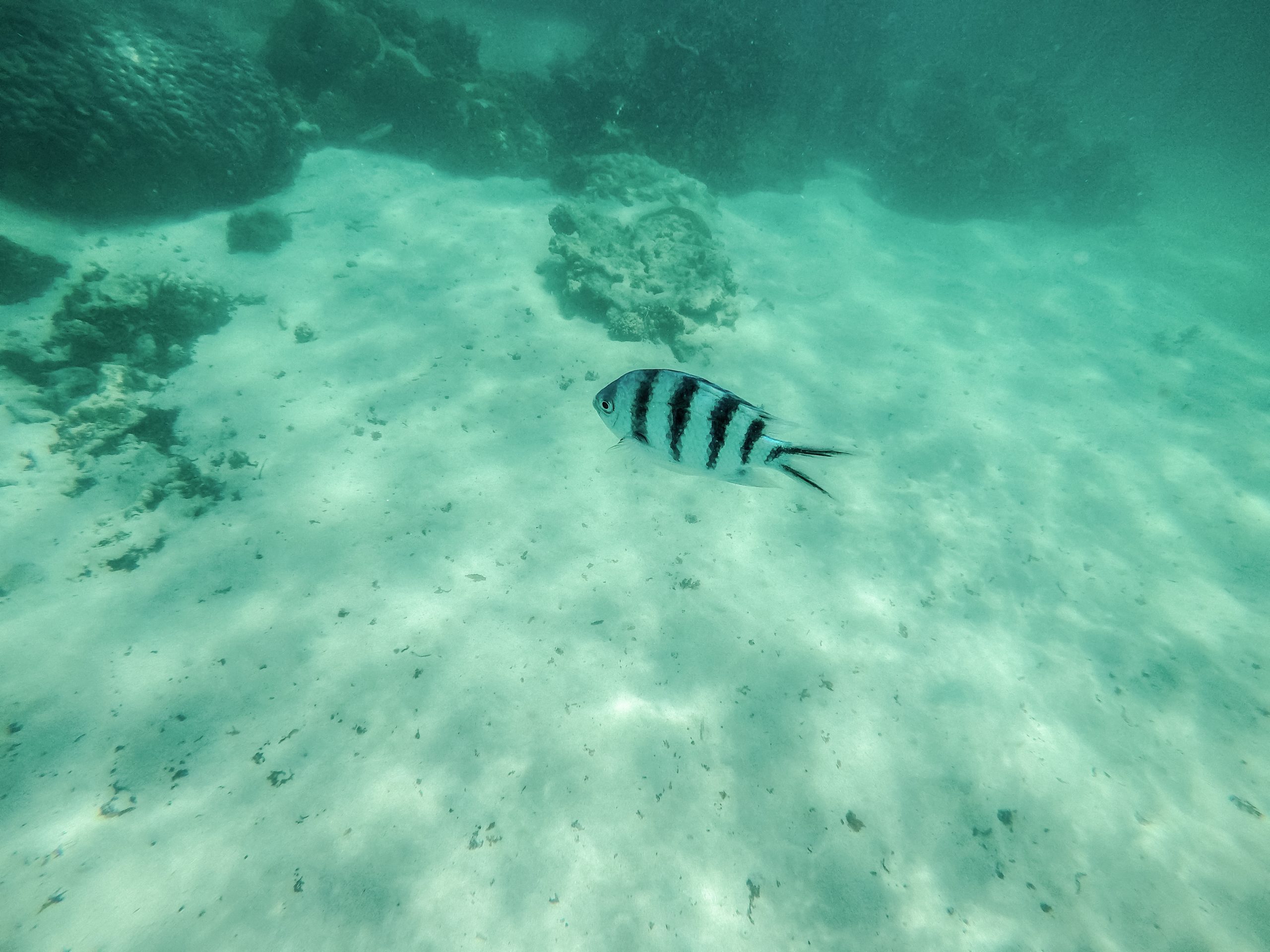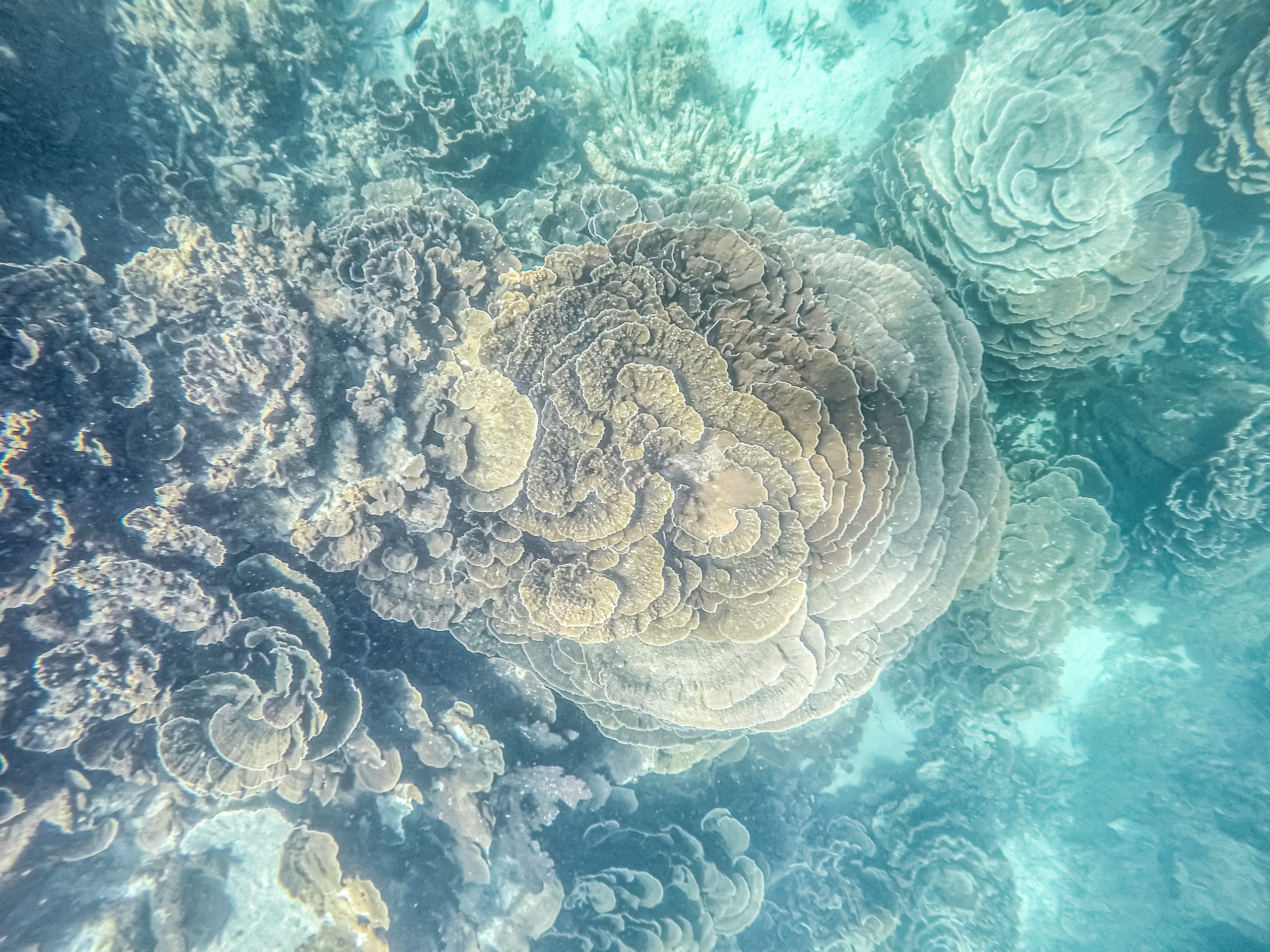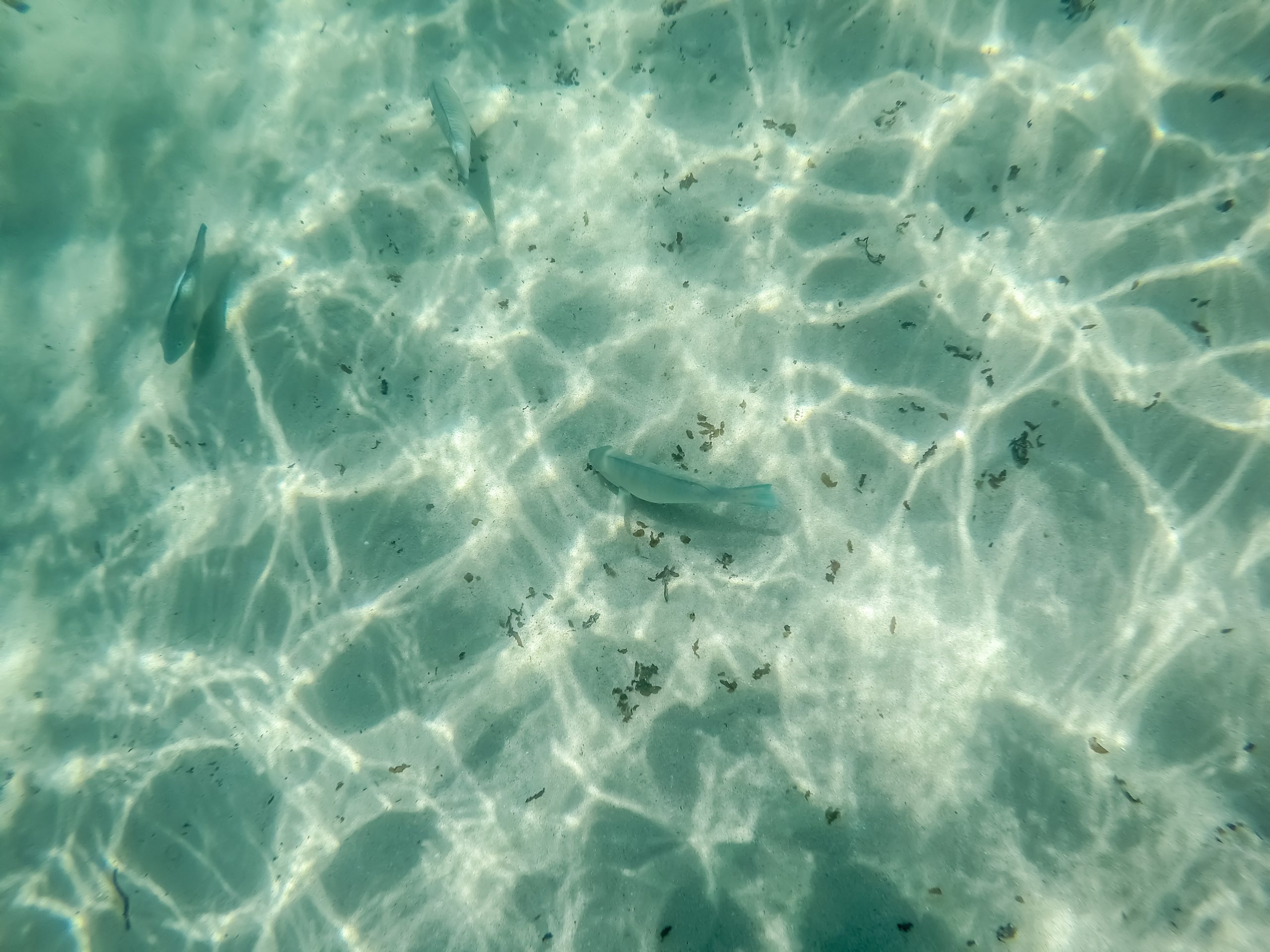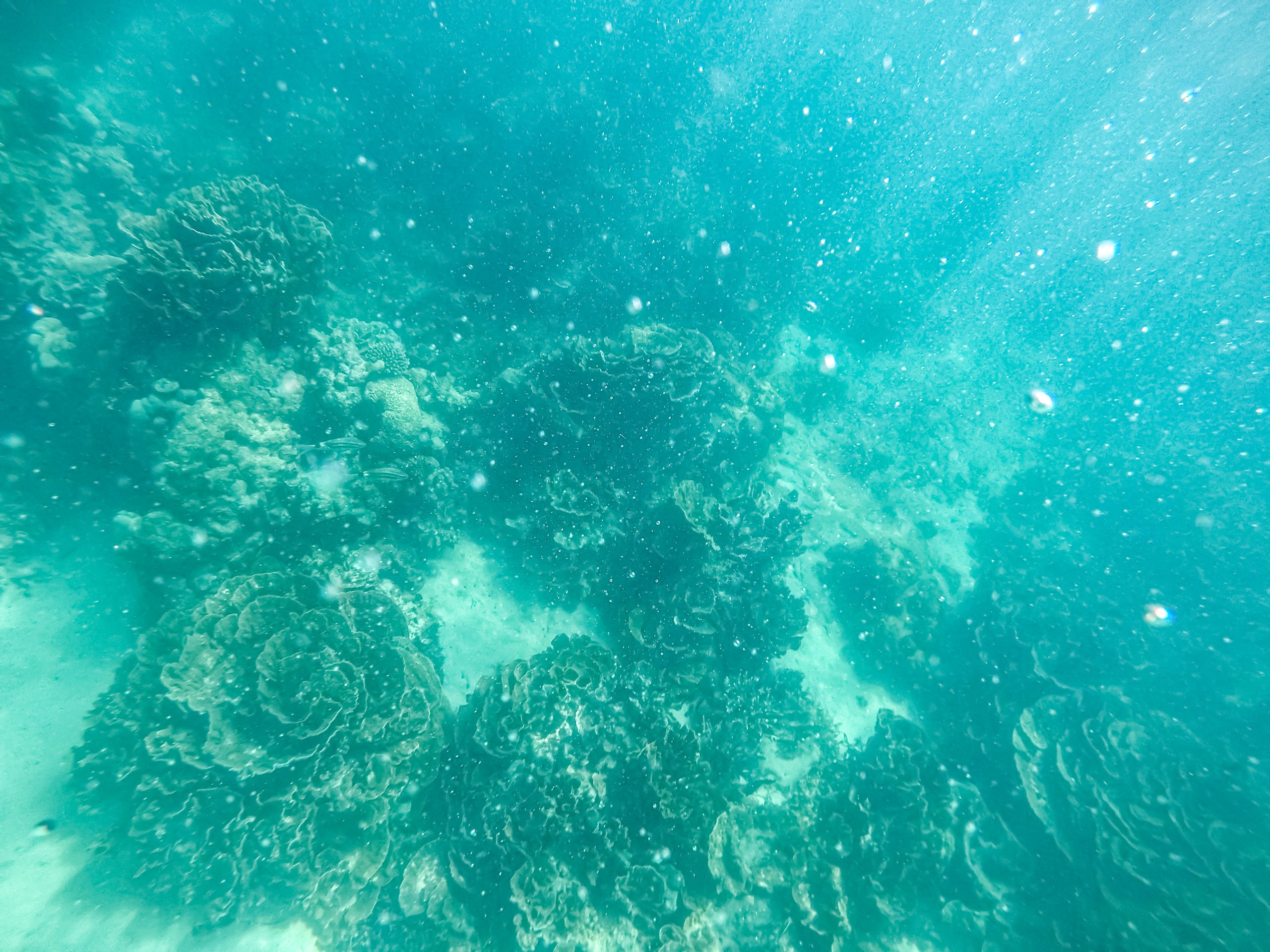Le moral n’était pas bon. Alors, pour nous réconforter, nous avons fait travailler notre bronzage ! Nous nous sommes posés sur la plage avec la mer turquoise, sable blanc et chaud. La baie offrait une vue magnifique. Avec nos masques et tubas, nous avons pu voir une multitude de poissons, des coraux et même une tortue!
